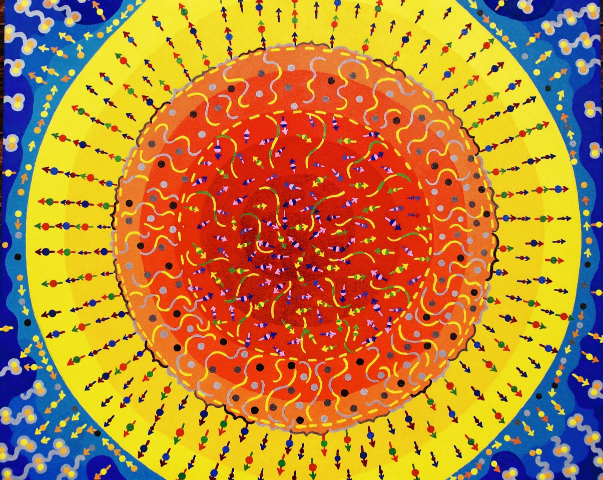 La symétrie est représentée au centre dans le cercle rouge, en allant vers l'extérieur dans les cercles en orange, apparaît la brisure de symétrie avec les bosons W et Z. Dans le cercle jaune chaque particule apparaît indépendante sur l'oeuvre : électron, neutrino, quark.
