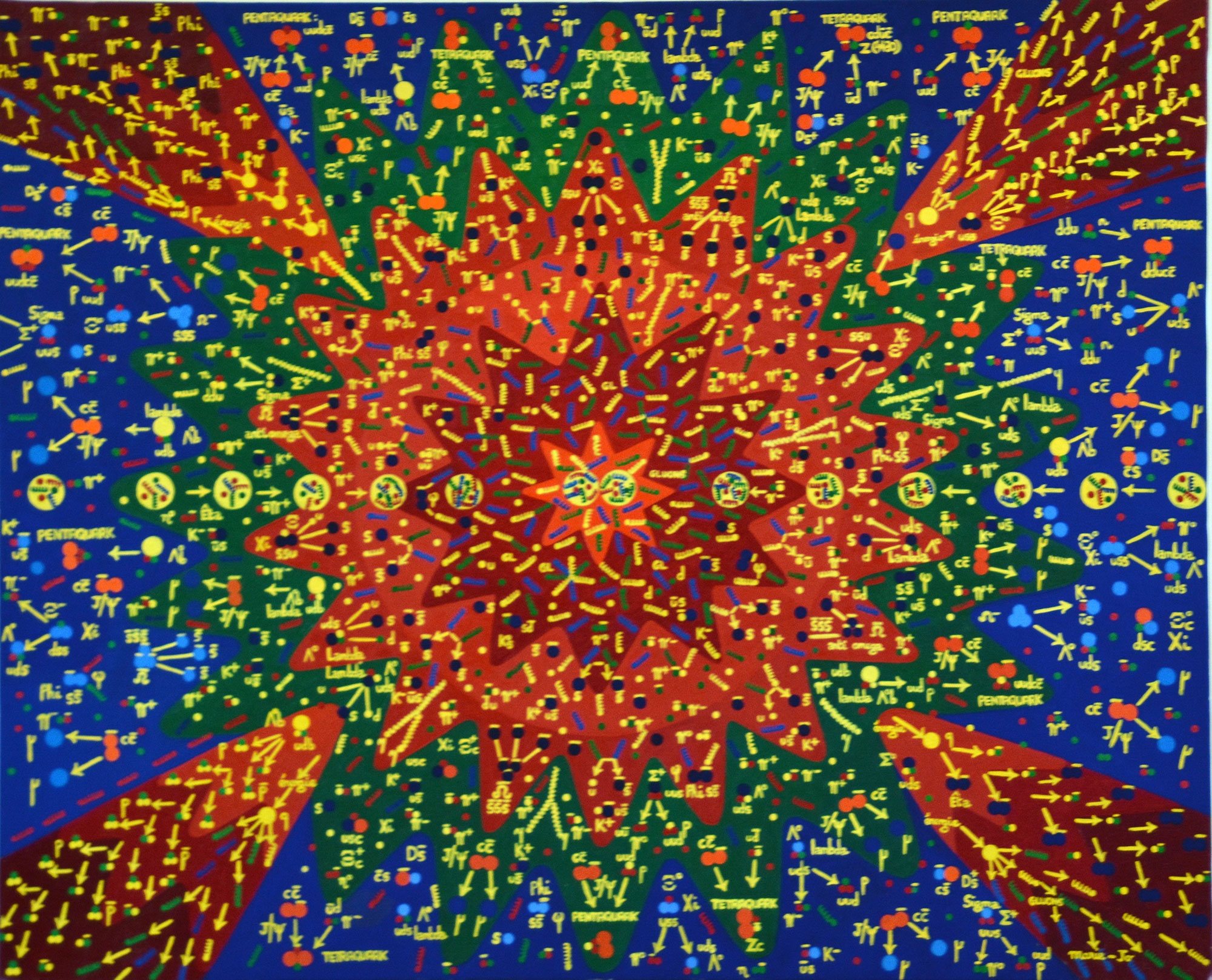 Partons avec cette oeuvre dans le monde de la physique des quarks : au centre de l'oeuvre le condensat de verre de couleur est constitué de gluons et transporte une énergie colossale. Puis apparaissent les premiers quarks. En allant vers l'extérieur nous croisons les premiers mésons : pions et kaons, puis dans la partie verte ce sont les baryons que nous découvrons ; et aux quatre angles de l'oeuvre les Jets Quenching ou jets de particules, étudiés depuis quelques années.