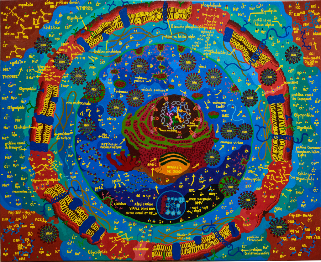I first express my gratitude to the teaching friends as well as the researcher emeritus in microbiology who guided me in this work and opened the doors to cell biology for me. At the top of the work and on the left, the Coronavirus in gray color enters the human cell. more information on my website mjpeintureastronomie.com, go to "biology" tab.