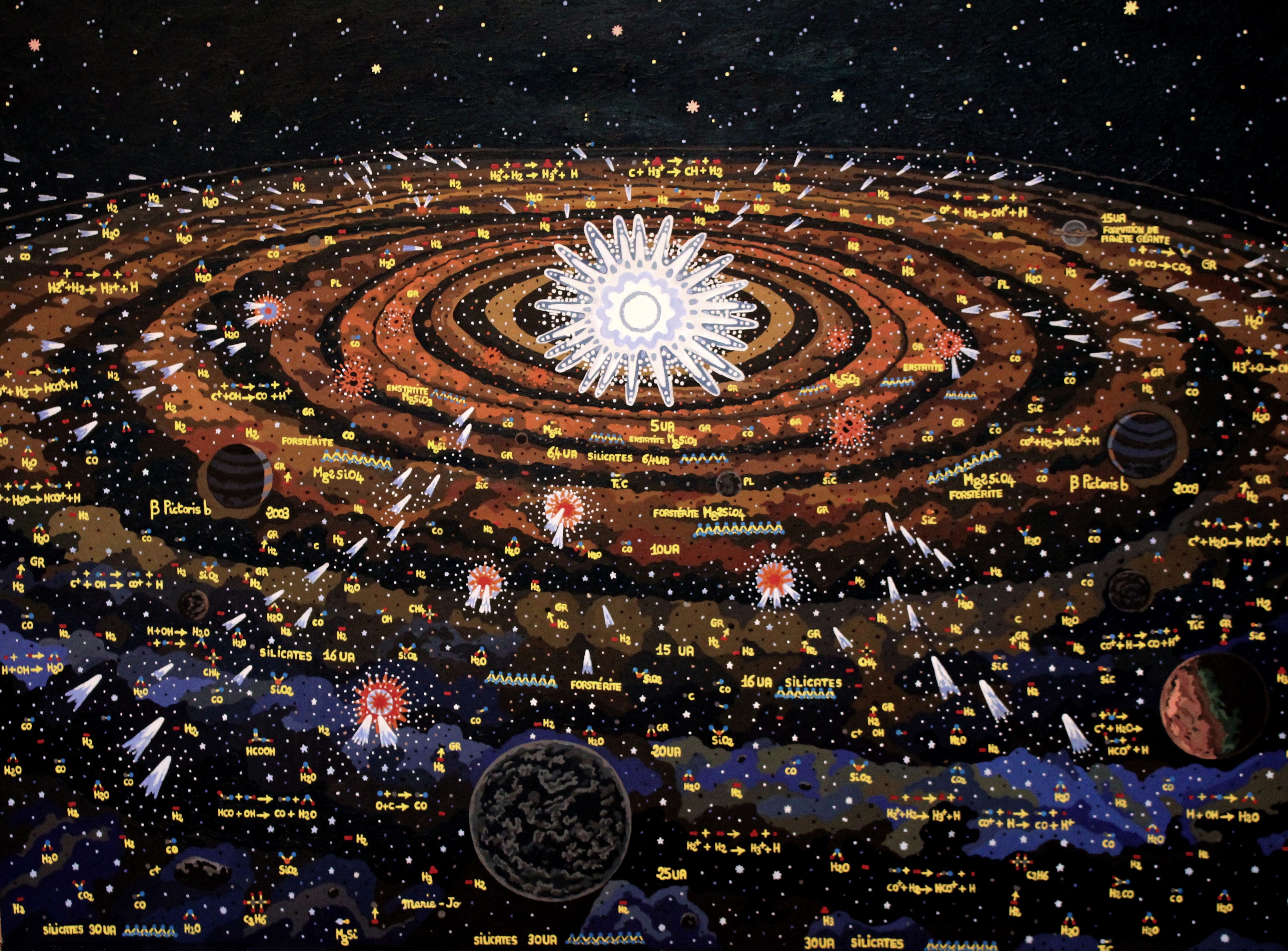 Nous partons dans un voyage interstellaire en direction de l'étoile Béta Pictoris située à 63 années lumière de la Terre. J'ai réalisé cette oeuvre avec la collaboration de Marc Bretton directeur de l'Observatoire Astronomique des Baronnies Provençales ainsi qu'en puisant des informations sur des lectures et sur internet.