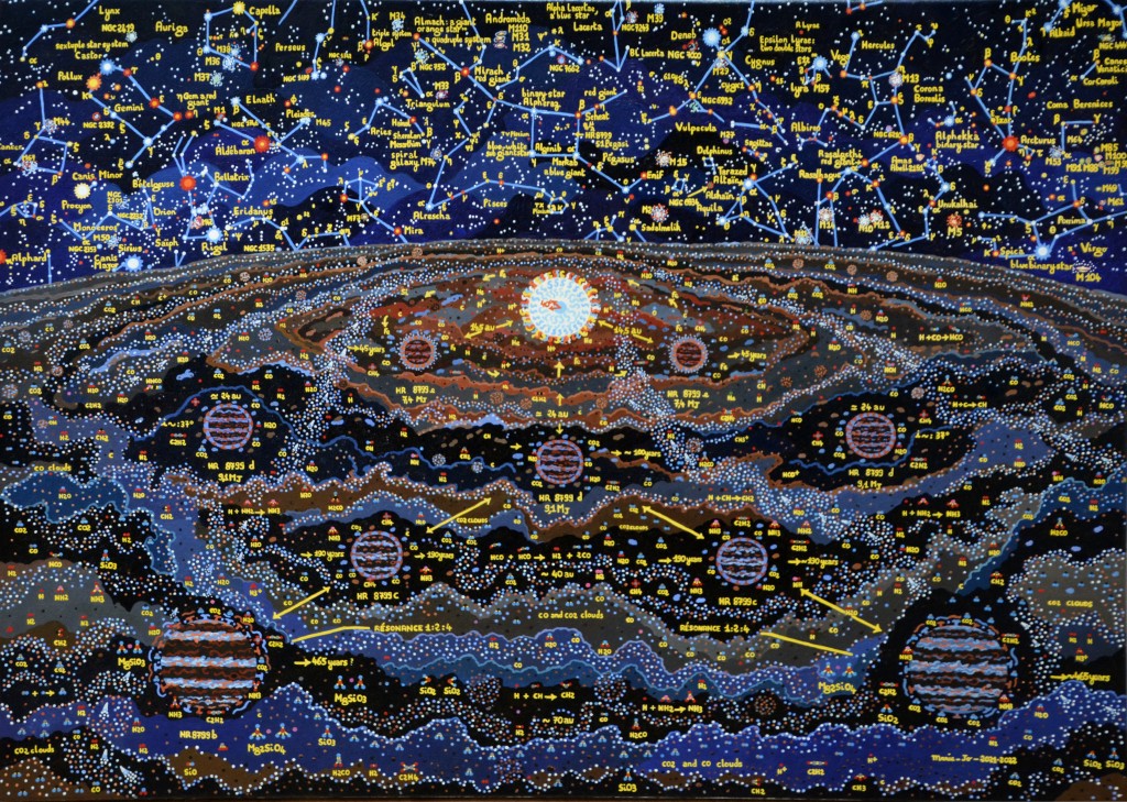 Tout d'abord je remercie particulièrement les chercheurs qui m'ont guidée à travers cette oeuvre grâce à leurs publications. Autour de l'étoile située à 129 années-lumière, évoluent quatre exoplanètes géantes gazeuses en une danse rythmique ; plus d'informations sur mon site internet http://mjpeintureastronomie.com - aller à "exoplanètes".