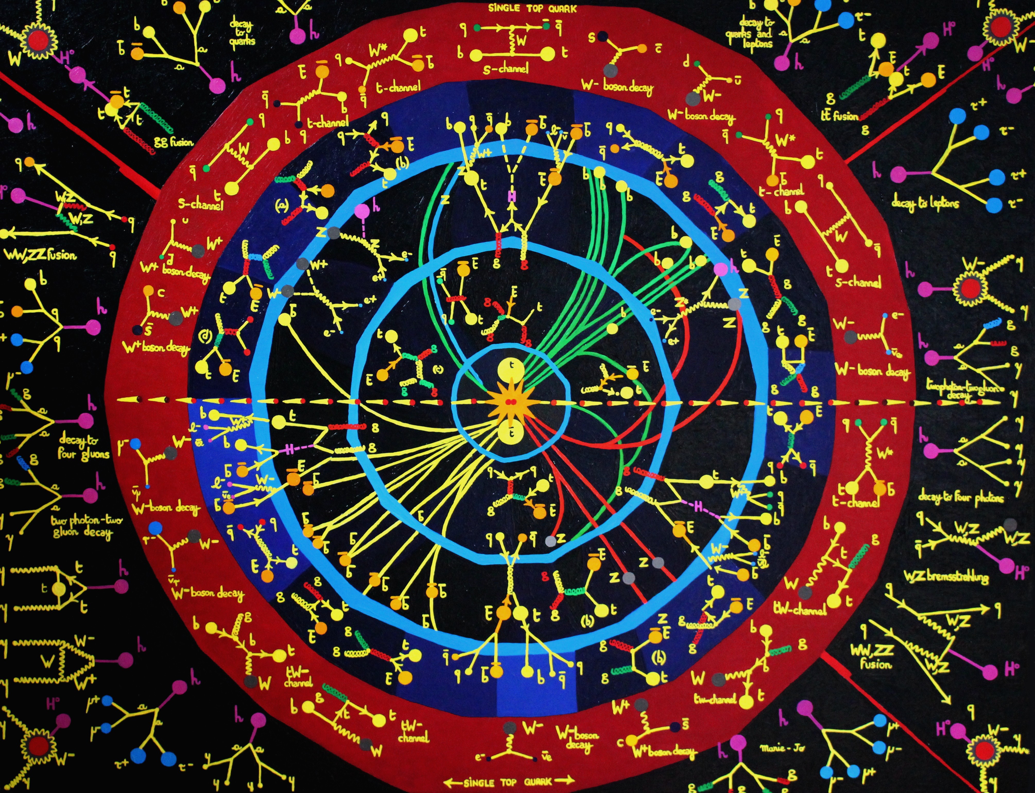 En partant du centre de l'oeuvre les jets en diagonales et en lignes courbes représentent les désintégrations en quarks b et anti b, ainsi qu'en bosons Z en boules grises (sur les lignes rouges vers le bas à droite). Tout autour apparaissent les productions et désintégrations de quarks gluons leptons et du Boson de Higgs en boules roses au bord de l'oeuvre.