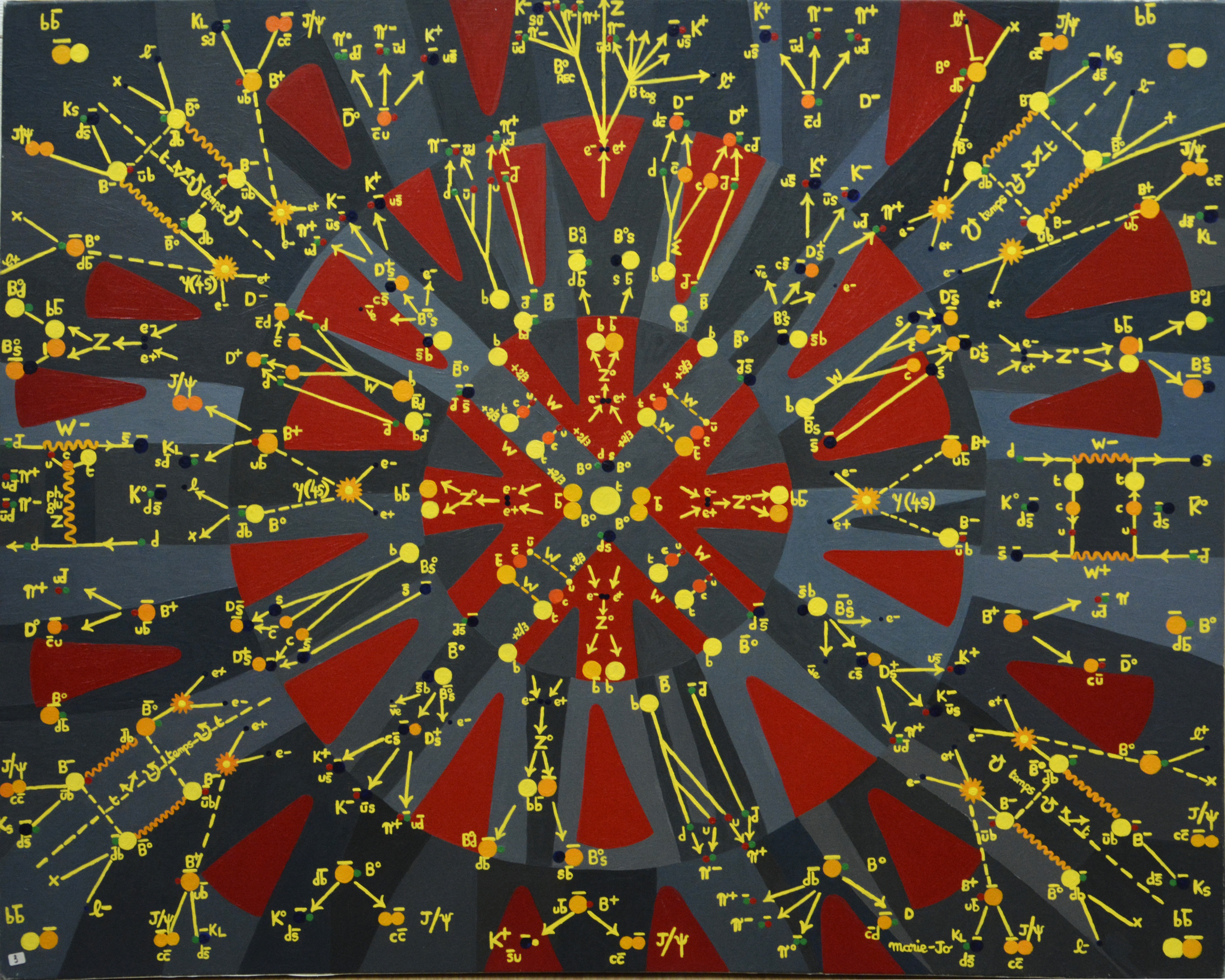 Avec cette oeuvre nous pénétrons dans le monde magique de la physique des particules : les mésons, particules constituées de deux quarks, oscillent et se transforment par l'intermédiaire des bosons W et Z...