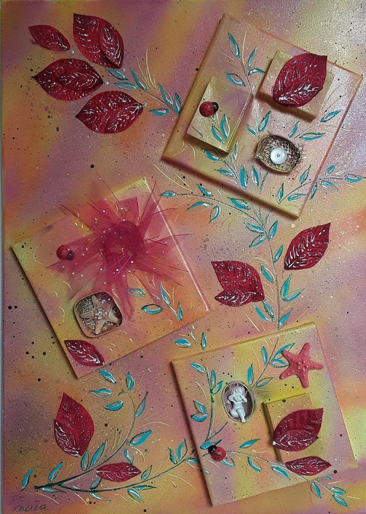 Description de l'oeuvre Acrylique et divers (collages, paillettes, perles...)