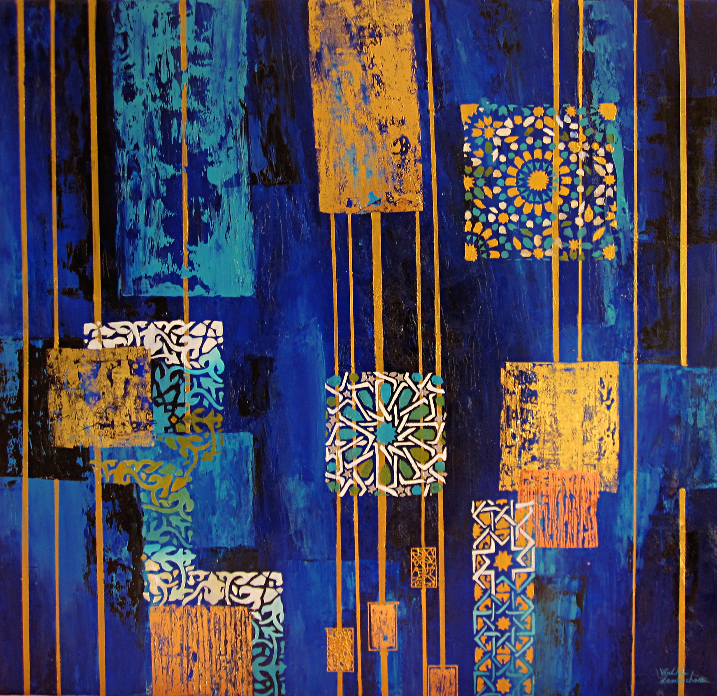 Huile sur toile - Technique mixte; acrylique et collage feuilles dorées.