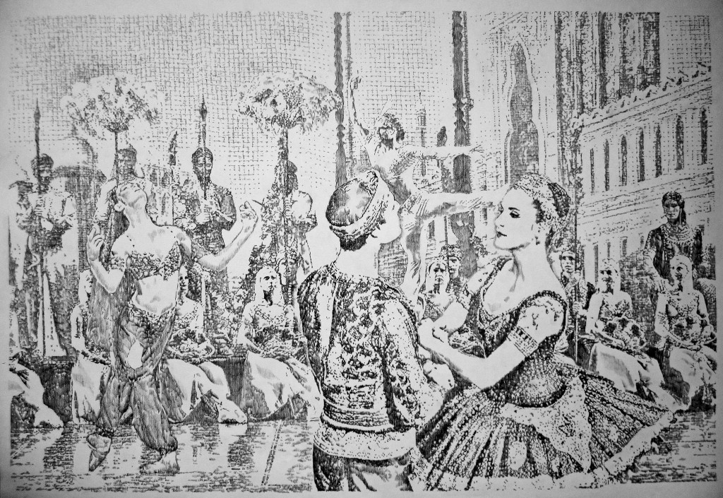 Ballet La Bayadère - série grands dessins format grand aigle : Dessin 6 - La célébration de l'amour. Crayon sur papier Ingres - Dimensions : 70 cm – 100 cm. Recontextualisation des éléments chorégraphiques a des moments différents du Ballet la Bayadère. Chaque dessin est une nouvelle histoire, une nouvelle intrigue, c’est une nouvelle annotation chorégraphique et spatiale. L’intensité dramatique de cette mise en scène est accentuée par la dichotomie ombre/lumière tandis que les éléments architecturaux créent une charge émotionnelle qui transportent le regardeur en Inde, celle des Maharajas. Le traitement en trame de traits verticaux donne un effet tissé et renvoie au textile, au costum