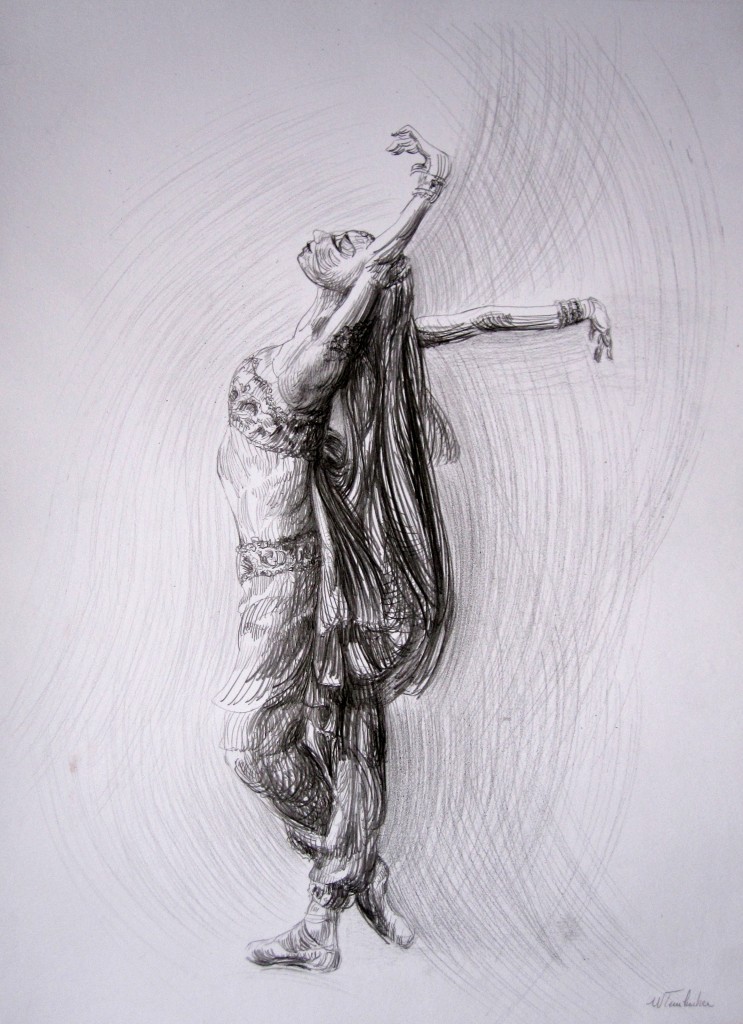 La Bayadère l'histoire d'un ballet en dessin : crayon, sanguine, pastel, encre de chine, encres ecolines et technique mixte.Lignes courtes ou longues continues ou discontinues, courbes, parallèles ou croisés renforce l'intensité du mouvement des danseurs, l'expressivité des visages et donne vie au costume, à sa matière et sa splendeur.