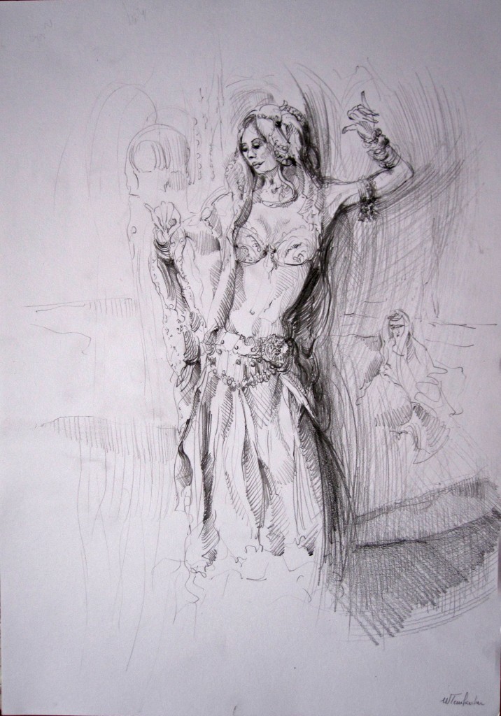 La Bayadère l'histoire d'un ballet en dessin : crayon, sanguine, pastel, encre de chine, encres ecolines et technique mixte.Lignes courtes ou longues continues ou discontinues, courbes, parallèles ou croisés renforce l'intensité du mouvement des danseurs, l'expressivité des visages et donne vie au costume, à sa matière et sa splendeur.