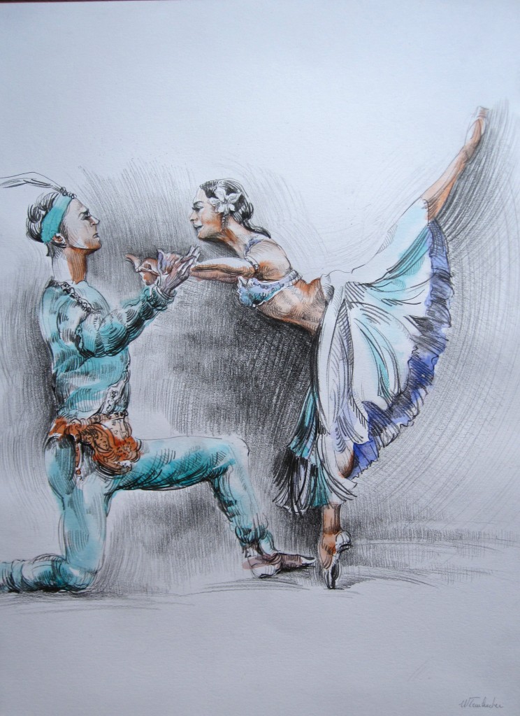 La Bayadère l'histoire d'un ballet en dessin : crayon, sanguine, pastel, encre de chine, encres ecolines et technique mixte.Lignes courtes ou longues continues ou discontinues, courbes, parallèles ou croisés renforce l'intensité du mouvement des danseurs, l'expressivité des visages et donne vie au costume, à sa matière et sa splendeur.