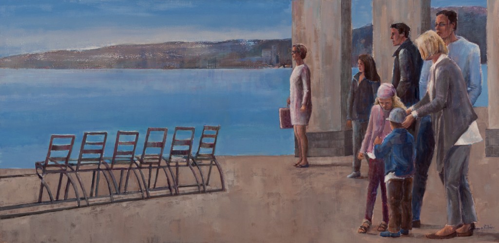 Des personnages groupés à droite de la toile semblent attendre tout en regardant vers le lointain. Au second plan, un lac ou une mer. Des chaises vides composent la partie gauche.