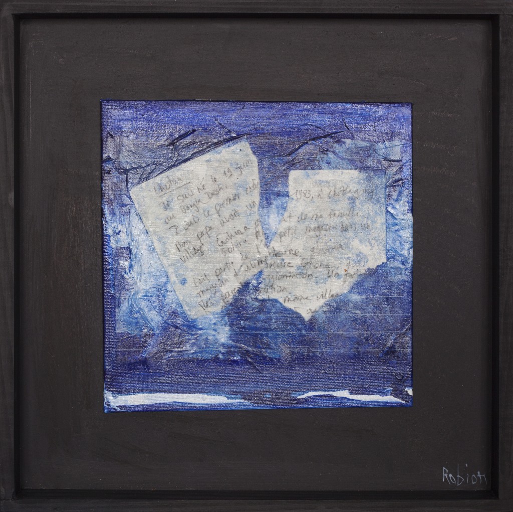 Extrait du manuscrit de l'histoire, feuille du carnet "Année scolaire 2012-2013" insertion dans peinture sur carton entoilé, boitage bois et contreplaqué.