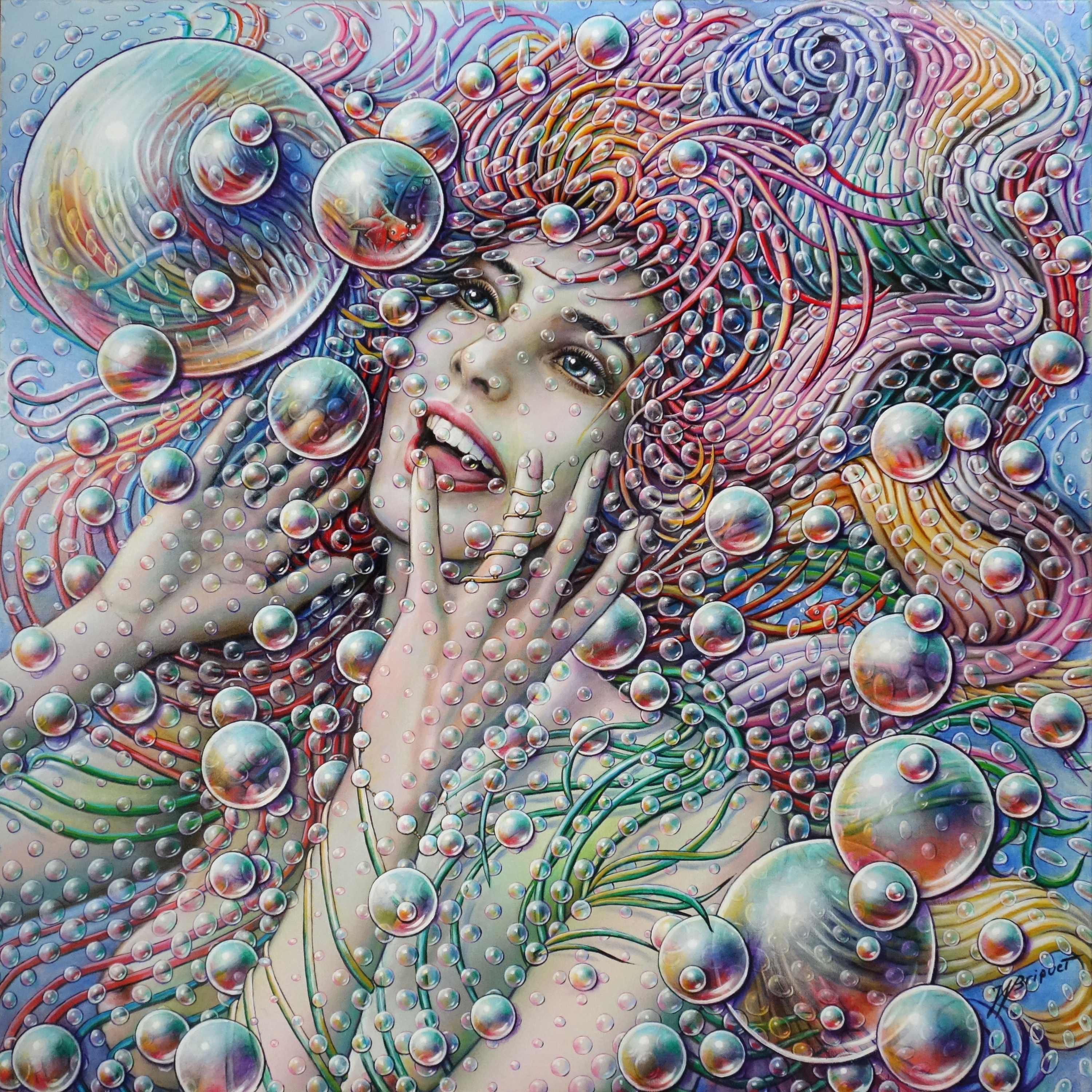 Cette jeune sirène joyeuse est vraiment surprise et impressionnée par ces grosses bulles .
