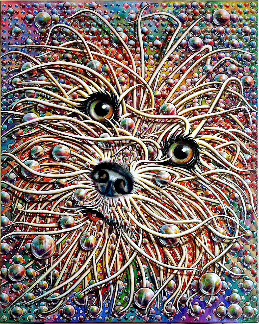Masque de chien, sculpture flottante, collage 3D, cette œuvre étonnante nous transporte dans l' univers au gré des constellations, des étoiles et des planètes.