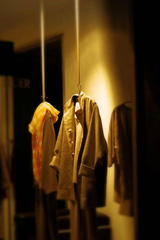 Des vêtements dans une vitrine la nuit.