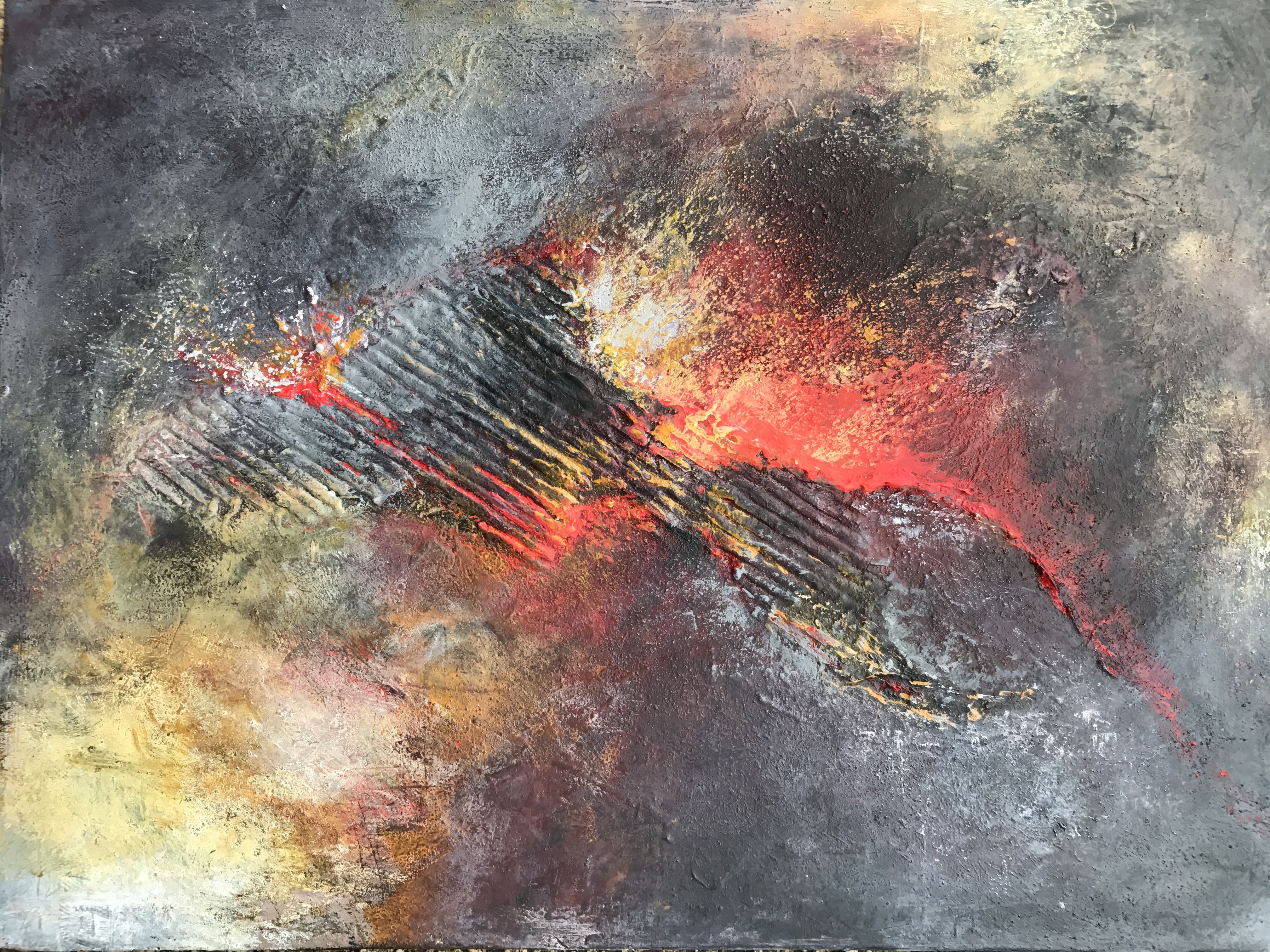 Une composition complexe, beaucoup de matière, collage, couleurs harmonieusement étalés ...dans un instant d'éruption du chaos....2017