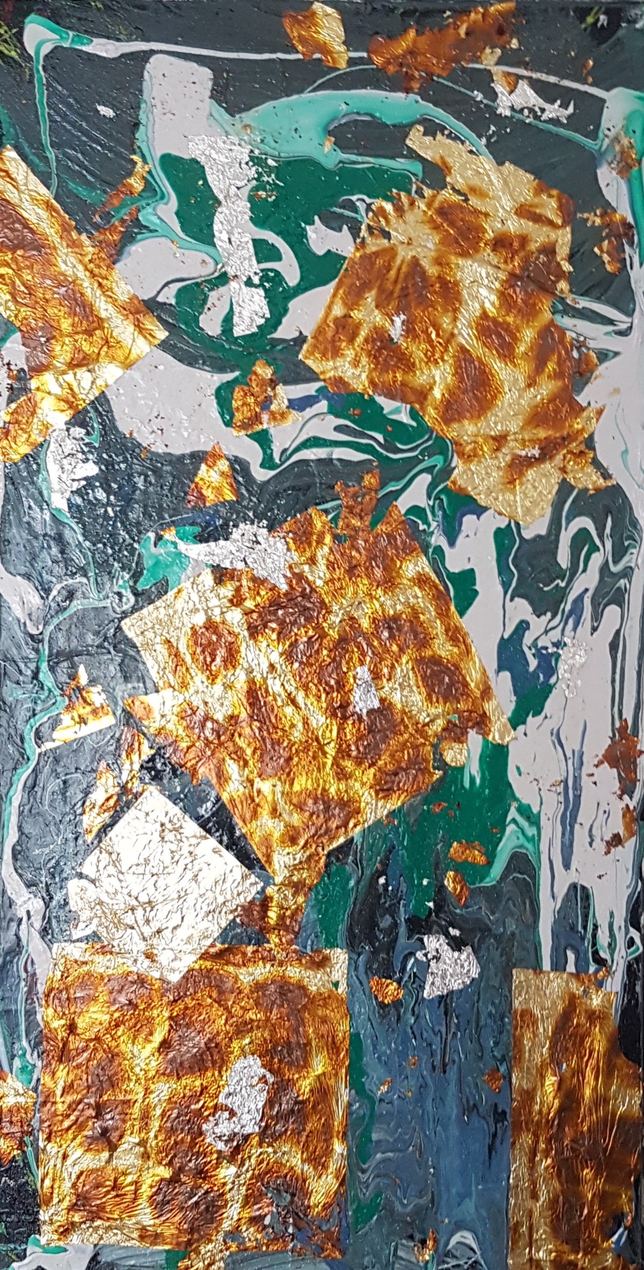 Description de l'oeuvre Toile sur châssis. Acrylique et feuilles d'or (24k), feuilles tachetées et argentées. 2020