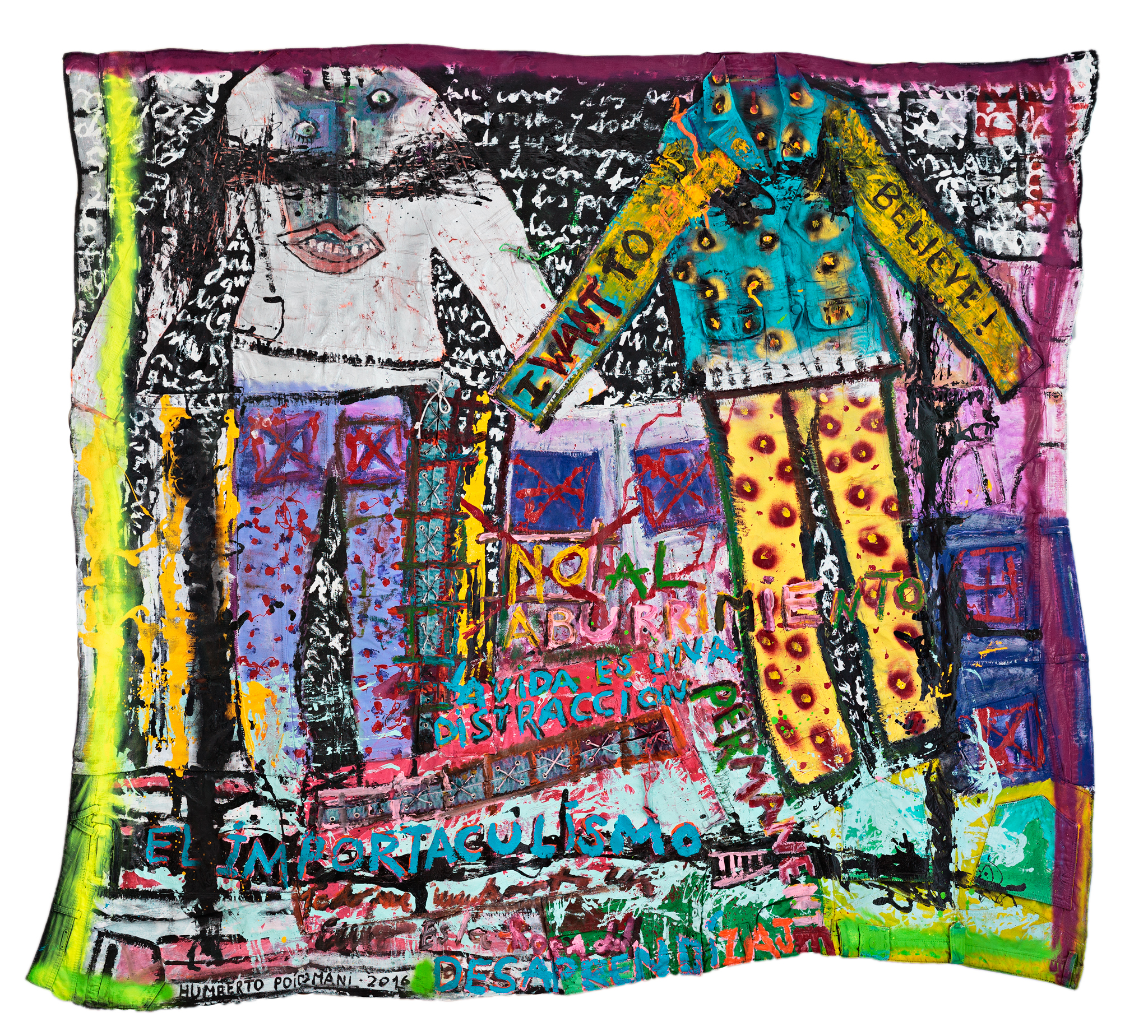 Description de l'oeuvre OIL, Acrylic, gesso, spray paints and crayons on recycled blue jeans.
