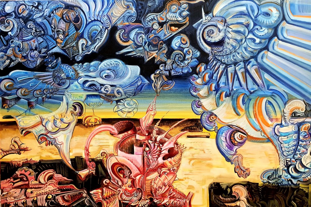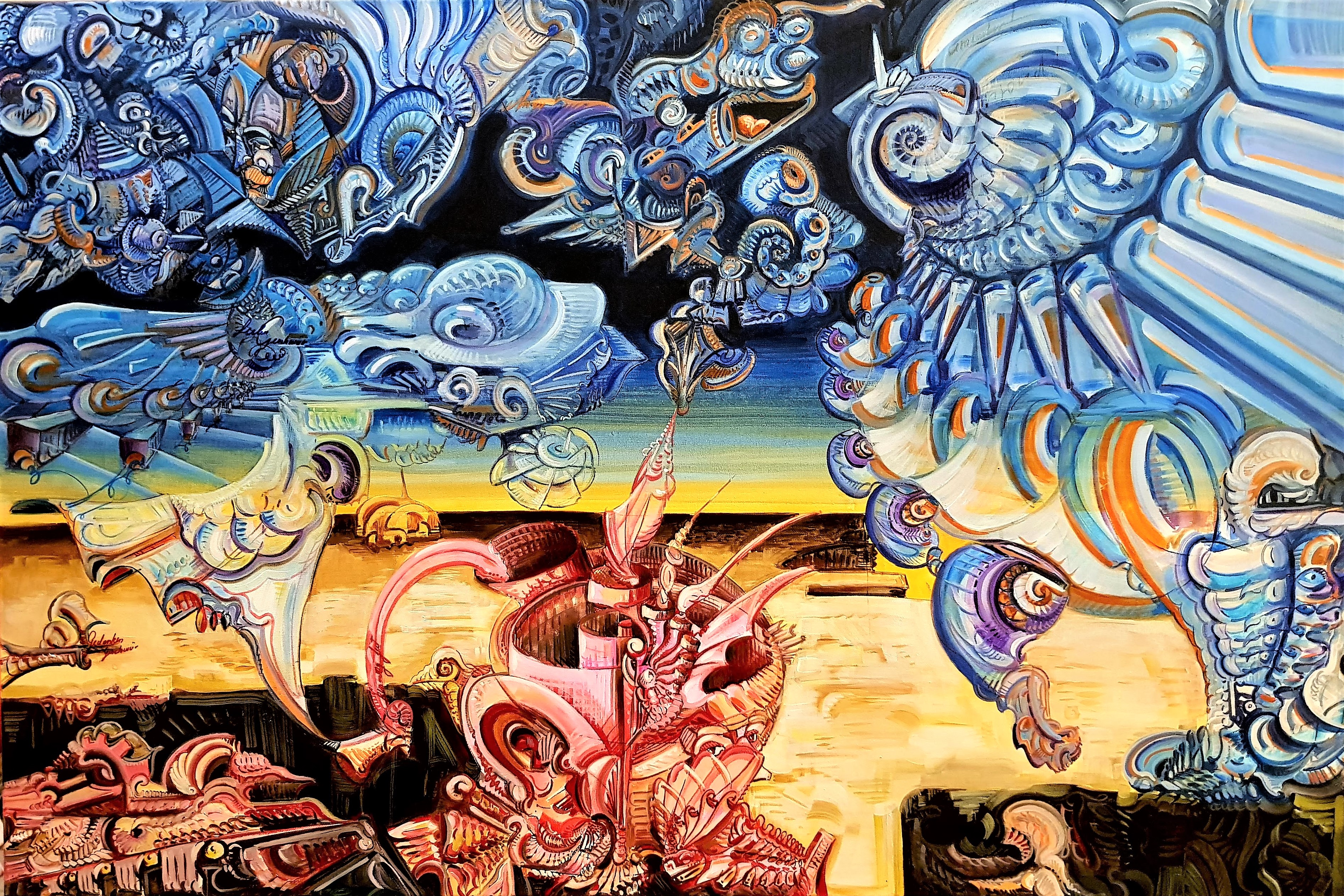 Description de l'oeuvre ce tableau decrit des mondes se rencontrant au dessus du désert.