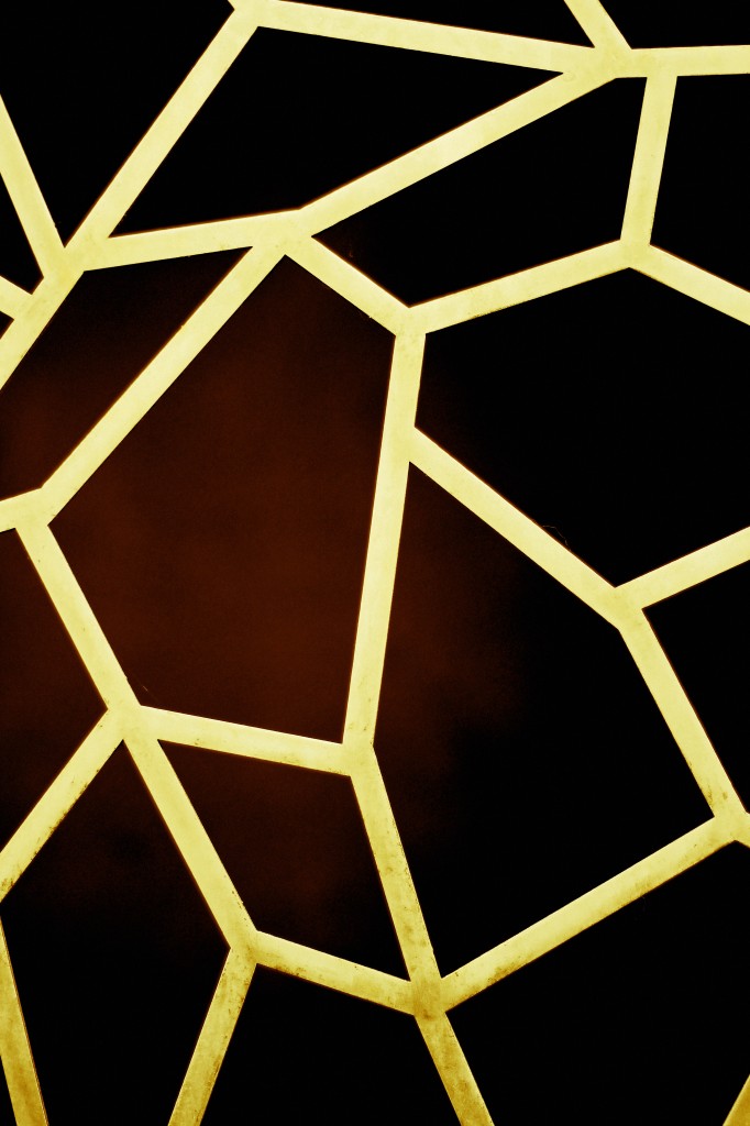 Fond noir avec une légère note rouge brun. Se détache une grille en laiton qui forme des motifs géométriques.