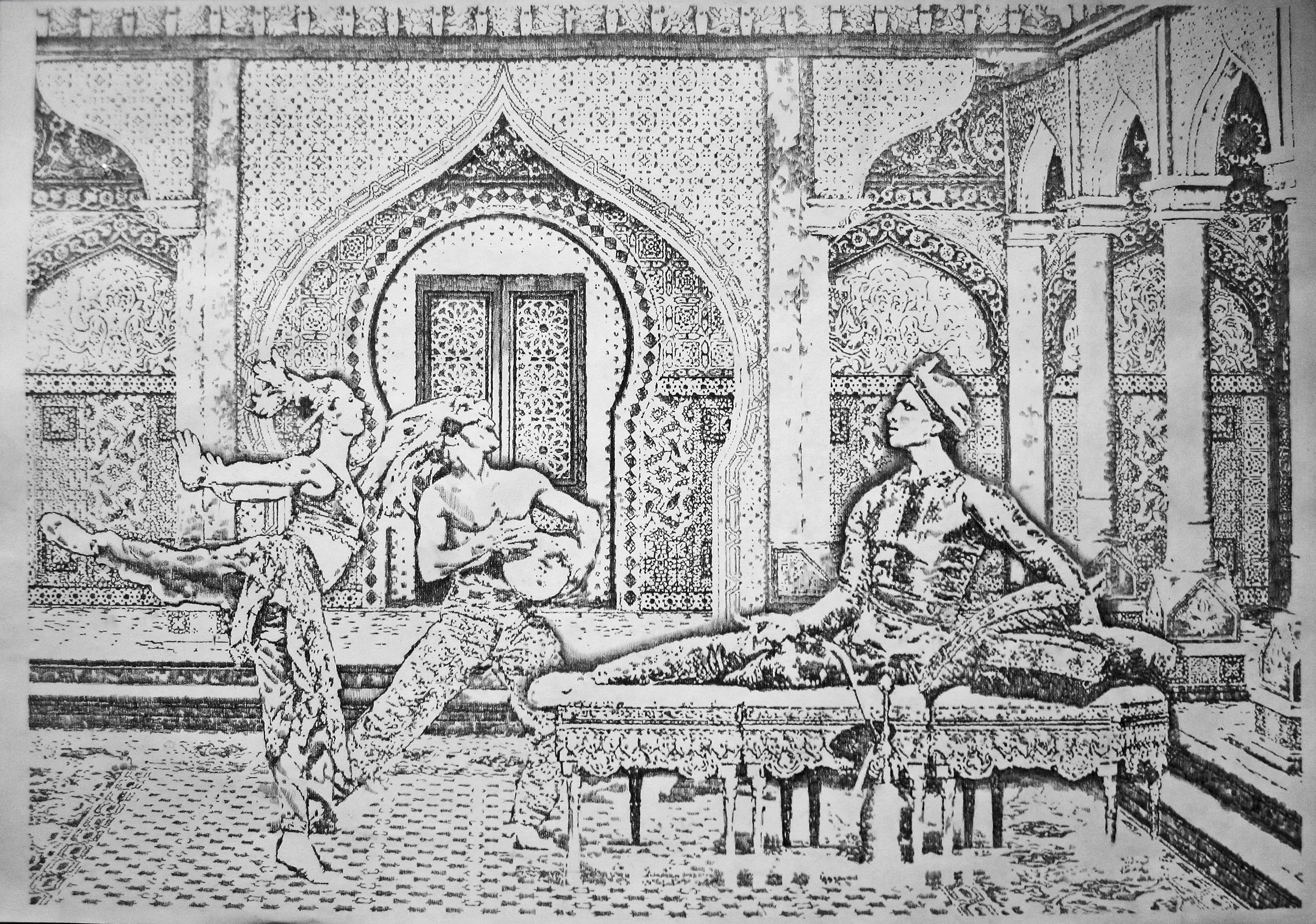 Ballet La Bayadère - série grands dessins format grand aigle : Dessin 4 - Hallucination de Solor au Narguilé. Crayon sur papier Ingres – Dimensions : 70 cm – 100 cm. Recontextualisation des éléments chorégraphiques a des moments différents du Ballet la Bayadère. A l’extérieur ou à l’intérieur d’un palais de Maharaja, la danse quitte la scène du théâtre quelque peu et installe un moment scénique tragique dans d’autres lieux. Chaque dessin est une nouvelle histoire, une nouvelle intrigue, c’est une nouvelle annotation chorégraphique et spatiale. L’intensité dramatique de cette mise en scène est accentuée par la dichotomie ombre/lumière tandis que les éléments architecturaux c