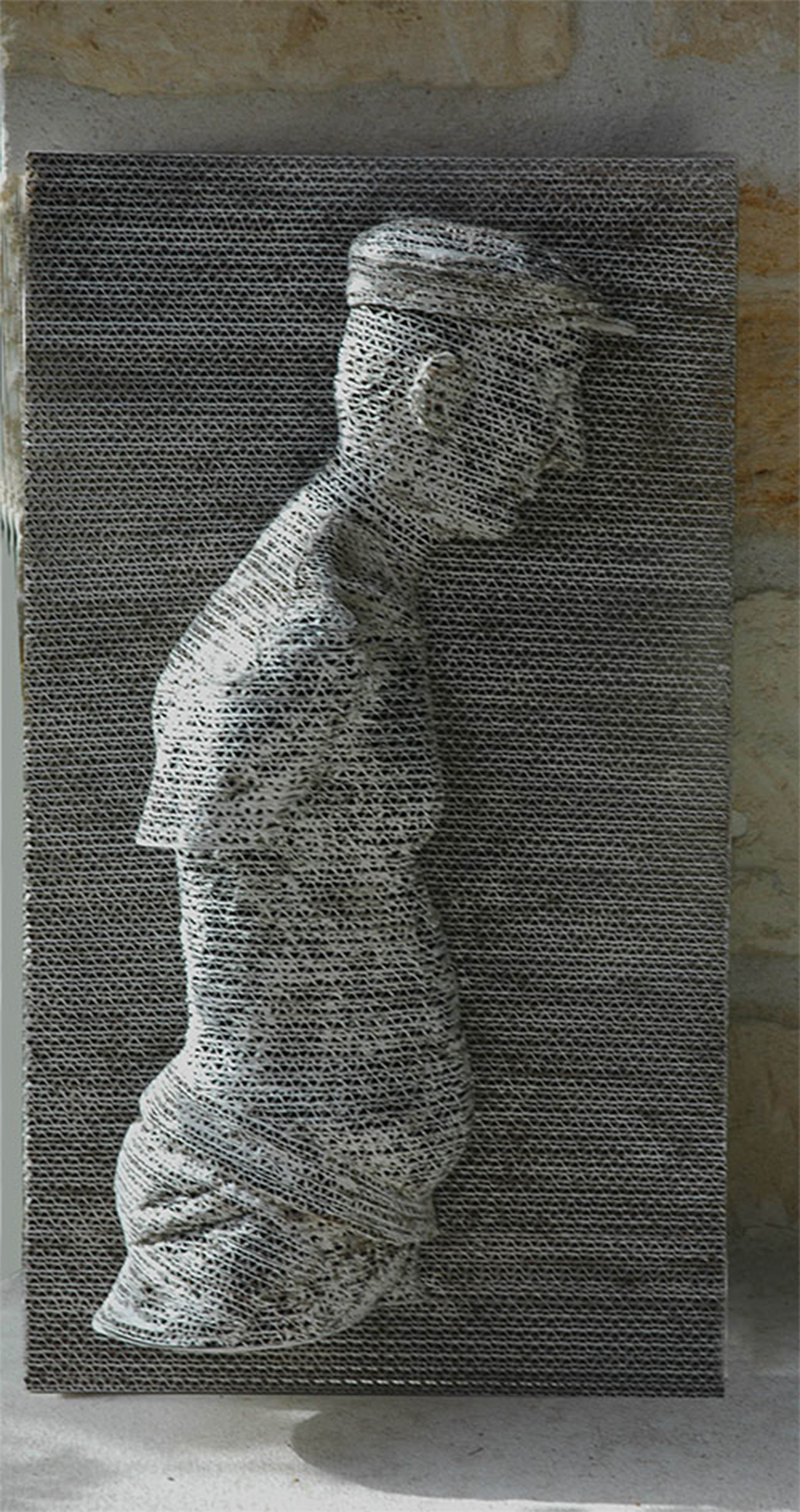 Sculpture en carton ondulé, type haut-relief. La sculpture est découpée au cutter, plaque par plaque de carton, à la manière d'une imprimante 3D, pour la finesse de la découpe. Peu de retouches au cutter pour garder la transparence du carton ondulé. Mes personnages sont dits à expression variable, car leur expression se modifie en fonction de la lumière. Enduit au gesso.