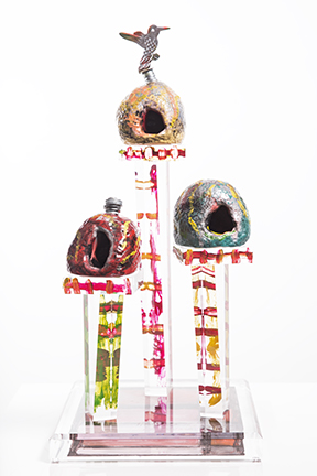 THE HORNEROS OF CAPPADOCIA is an edition of three sculptures each one with three different shapes and colors on clear acrylic bases.