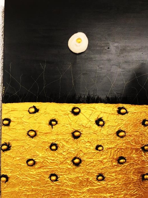 Description de l'oeuvre acrylic on canvas, mixed media collage, feathers, liquid gold