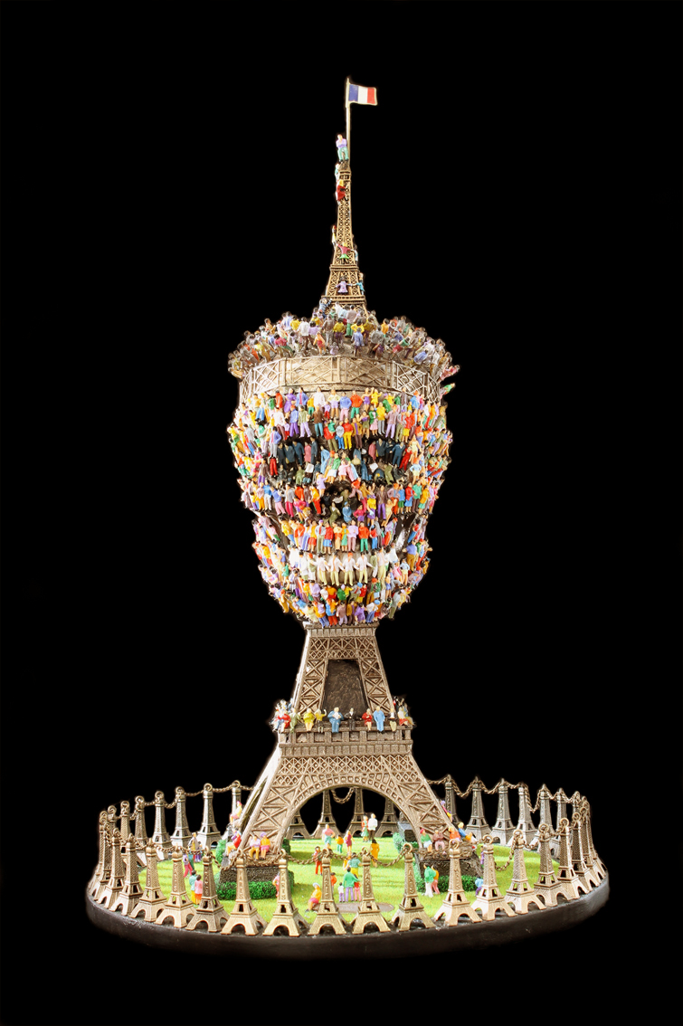 Techniques mixtes (petits personnages et tours Eiffel) sous globe en verre et plateau tournant