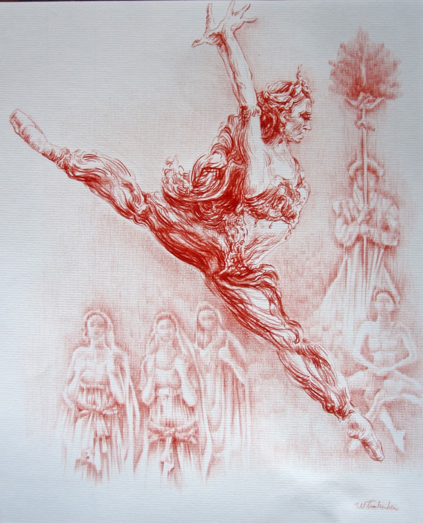 La Bayadère l'histoire d'un ballet en dessin : crayon, sanguine, pastel, encre de chine, encres ecolines et technique mixte.Lignes courtes ou longues continues ou discontinues, courbes, parallèles ou croisés renforce l'intensité du mouvement des danseurs, l'expressivité des visages et donne vie au costume, à sa matière et sa splendeur.