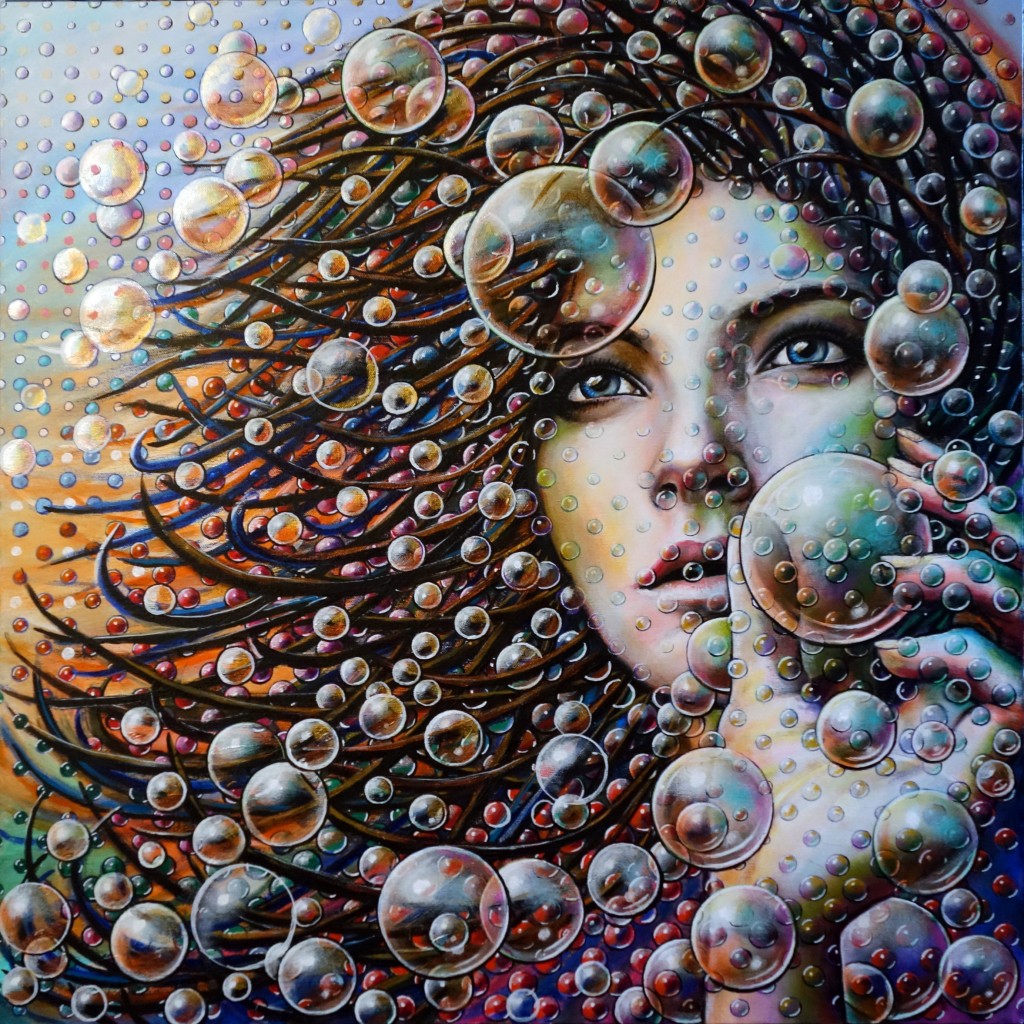 Peinture du visage d'une jeune fille amoureuse, impressionnée et amusée par la beauté des bulles.