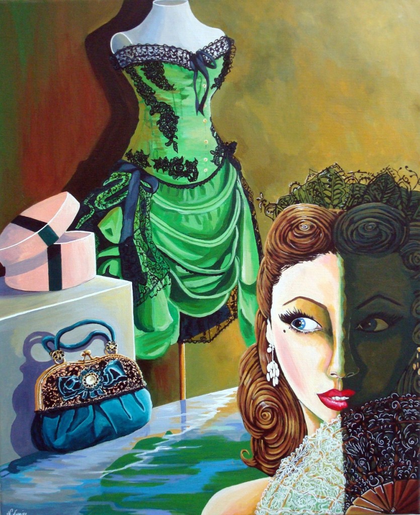 Hommage au monde du burlesque et du cabaret, du costume de théâtre , la femme en premier plan à droite entre dans la lumière , jeu de clair obscur et éventail devant elle .Elle se prépare à faire son "show" , regard langoureux ,pétillant et sexy de la Pin-up . La robe au 3ème plan est un costume de spectacle de cabaret , costume fait main ultra féminin.