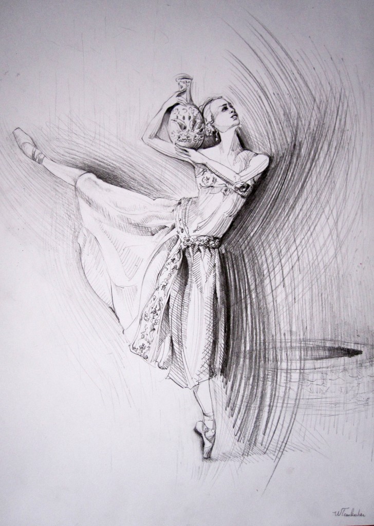 La Bayadère l'histoire d'un ballet en dessin : crayon, sanguine, pastel, encre de chine, encres ecolines et technique mixte.Lignes courtes ou longues continues ou discontinues, courbes, parallèles ou croisés renforce l'intensité du mouvement des danseurs, l'expressivité des visages et donne vie au costume, à sa matière et sa splendeur.