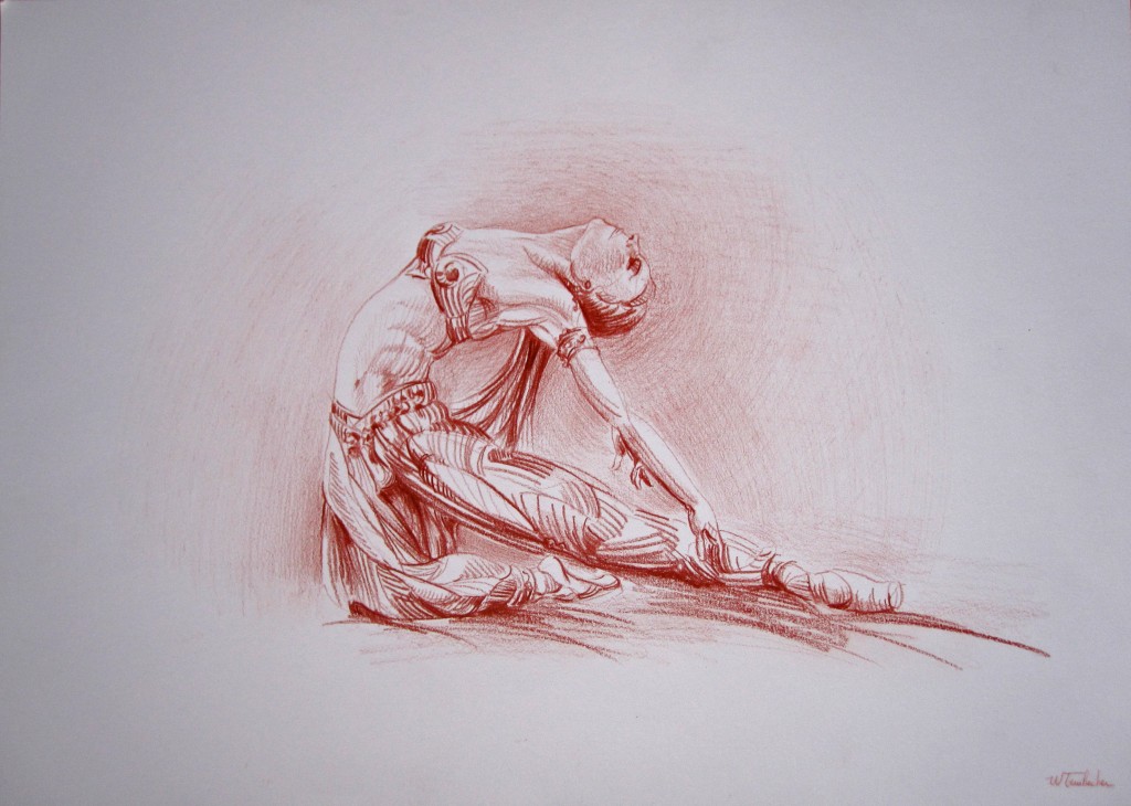 La Bayadère l'histoire d'un ballet en dessin : crayon, sanguine, pastel, encre de chine, encres ecolines et technique mixte.Lignes courtes ou longues continues ou discontinues, courbes, parallèles ou croisés renforce l'intensité du mouvement des danseurs, l'expressivité des visages et donne vie au costume, à sa matière et sa splendeur.