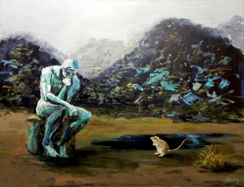 Je fixe le destin d’homo sapiens cinq minutes avant la fin pour que les derniers acteurs soient encore là. Sinon, après, plus d’herbe et plus de pétrole…et plus de rat sans doute : « avec le dernier rat » ? Est-ce en compagnie du dernier rat ou comme complément alimentaire ? La grammaire ici est équivoque…