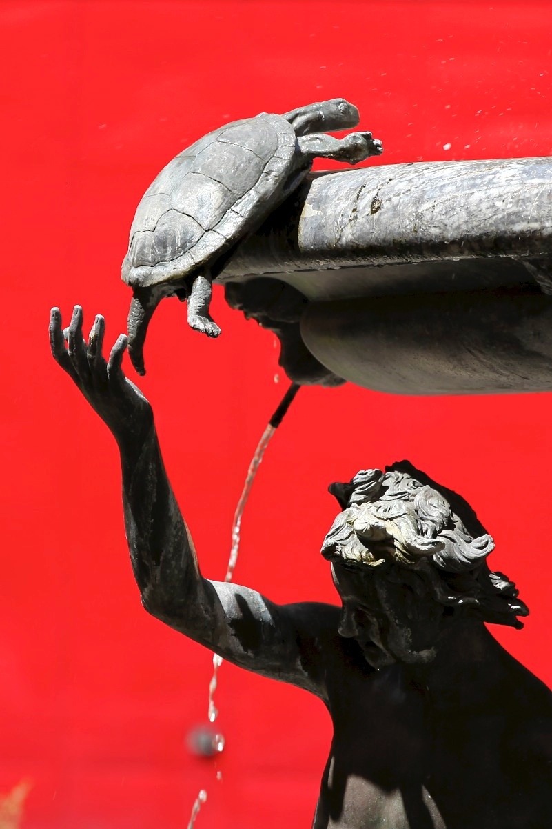 Piazza Mattei (ROME) La fontaine aux tortues. Bijou d'architecture du 16° siècle. Le Bernin aurait ajouté les tortues..... fond rouge du à la présence d'un camion...rouge.