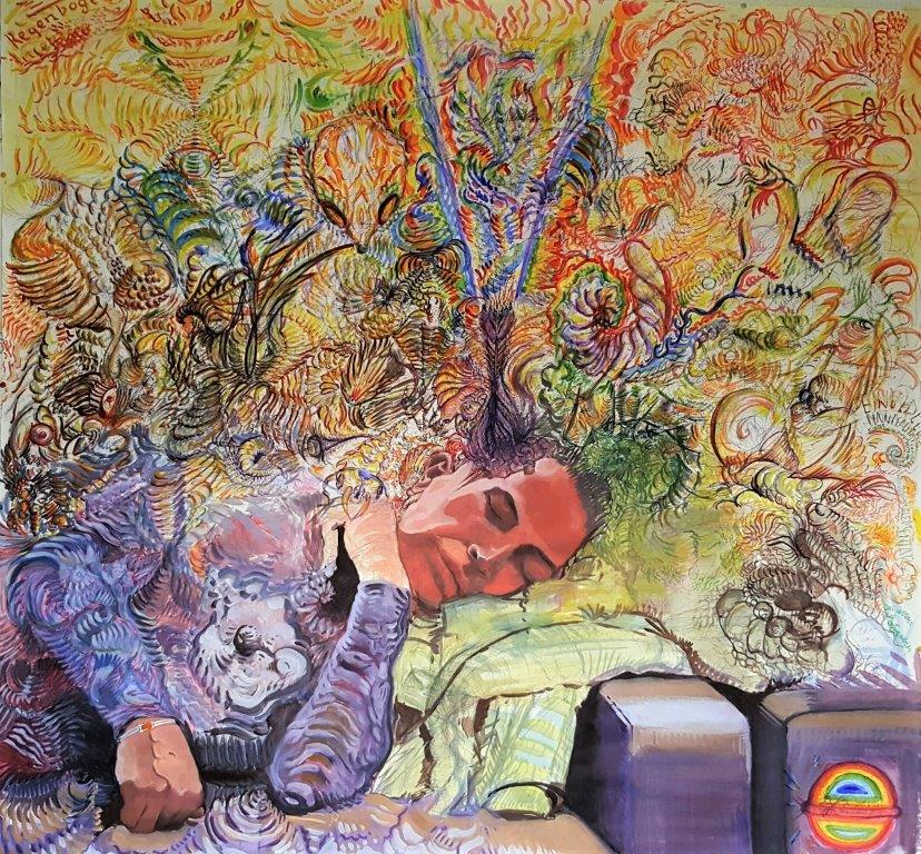 2016 - Multi/media sur Papier, encadré. Un homme fait une sieste et ses pensées se déroulent en tourbillons de couleurs