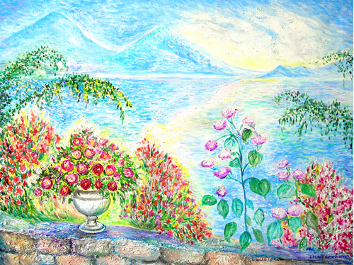 Description de l'oeuvre Sur les bords du Lac Majeur fleuris et ensoleillés. Peinture impressionniste sur toile, avec relief.