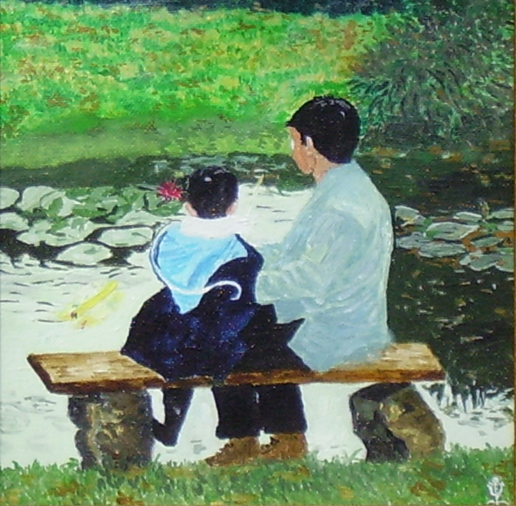 Description de l'oeuvre Un bateau vogue sur la mare. Sur le banc le père et le fils rêvent
