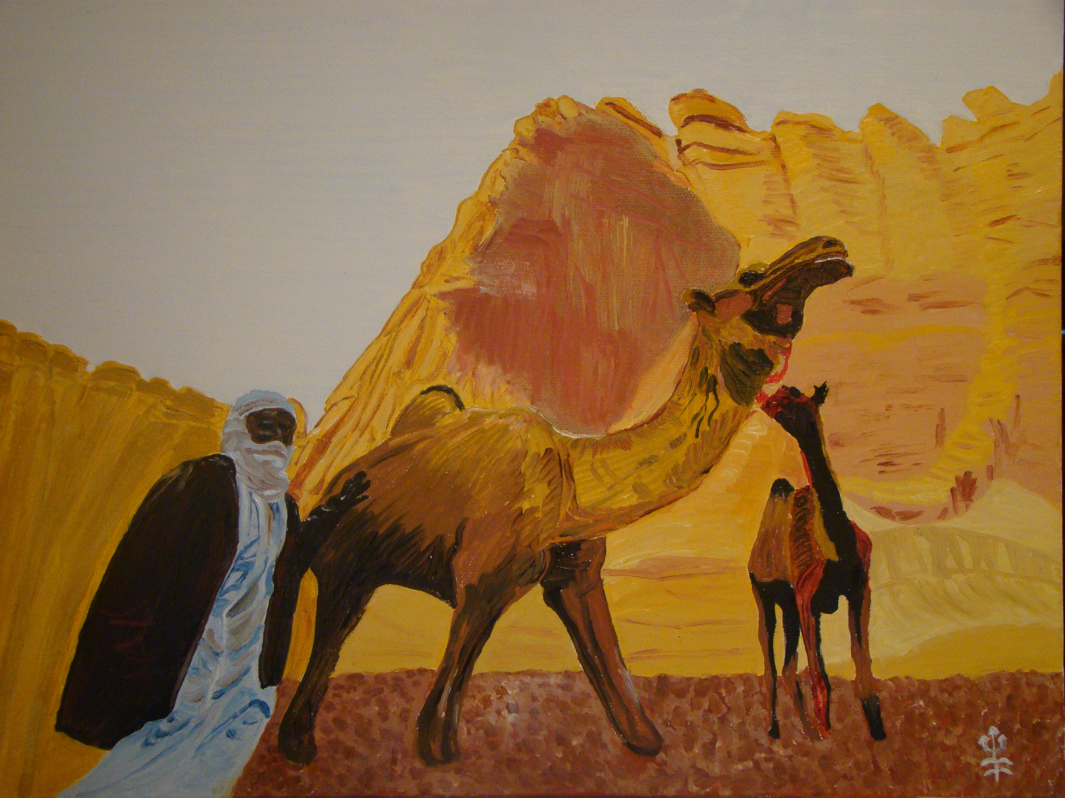 Description de l'oeuvre Flatté par l'homme, soutenu par son chamelon, il poursuit sa route vers l'oasis