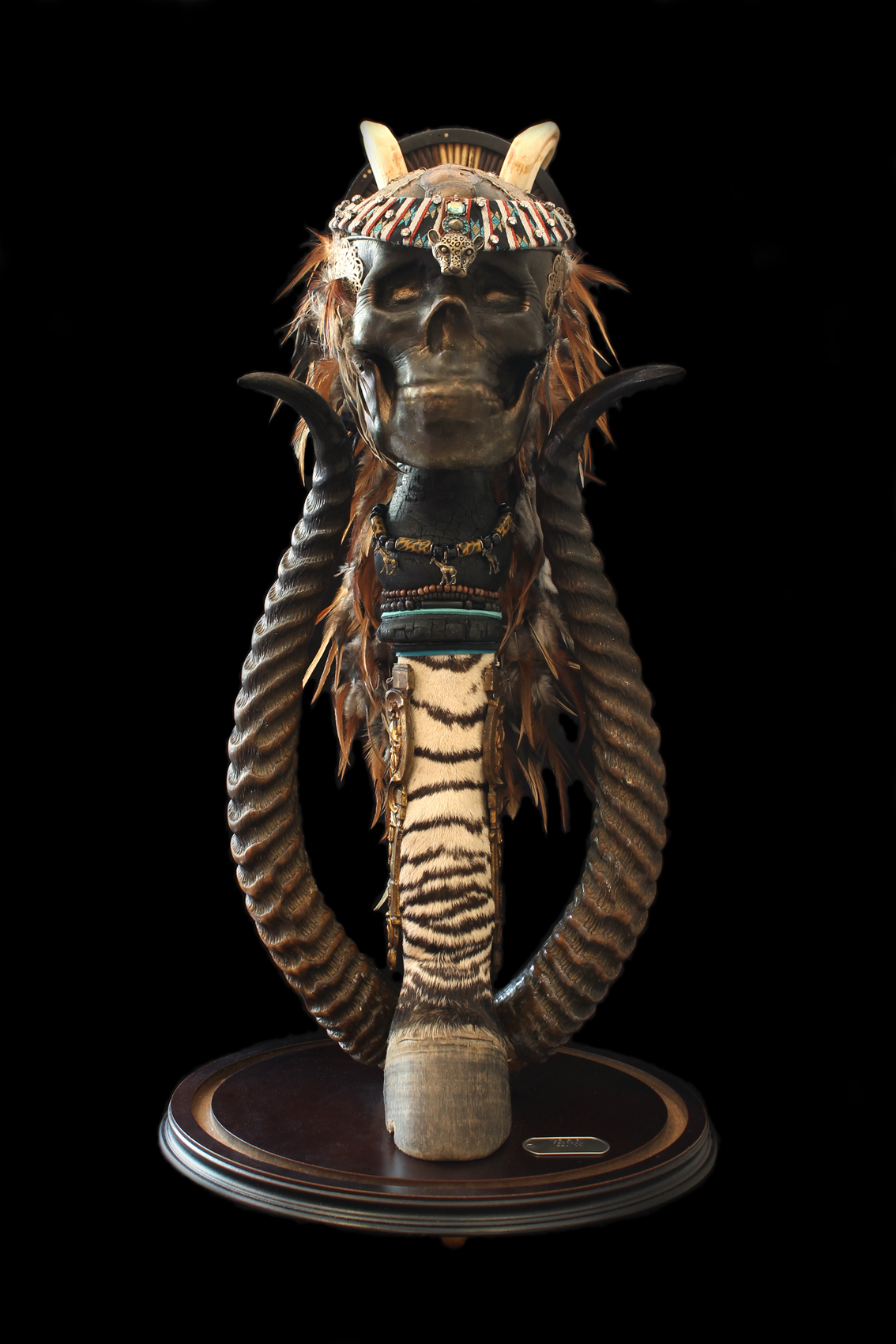 Techniques mixtes (dont pied de zèbre et cornes d'antilope) sous globe en verre