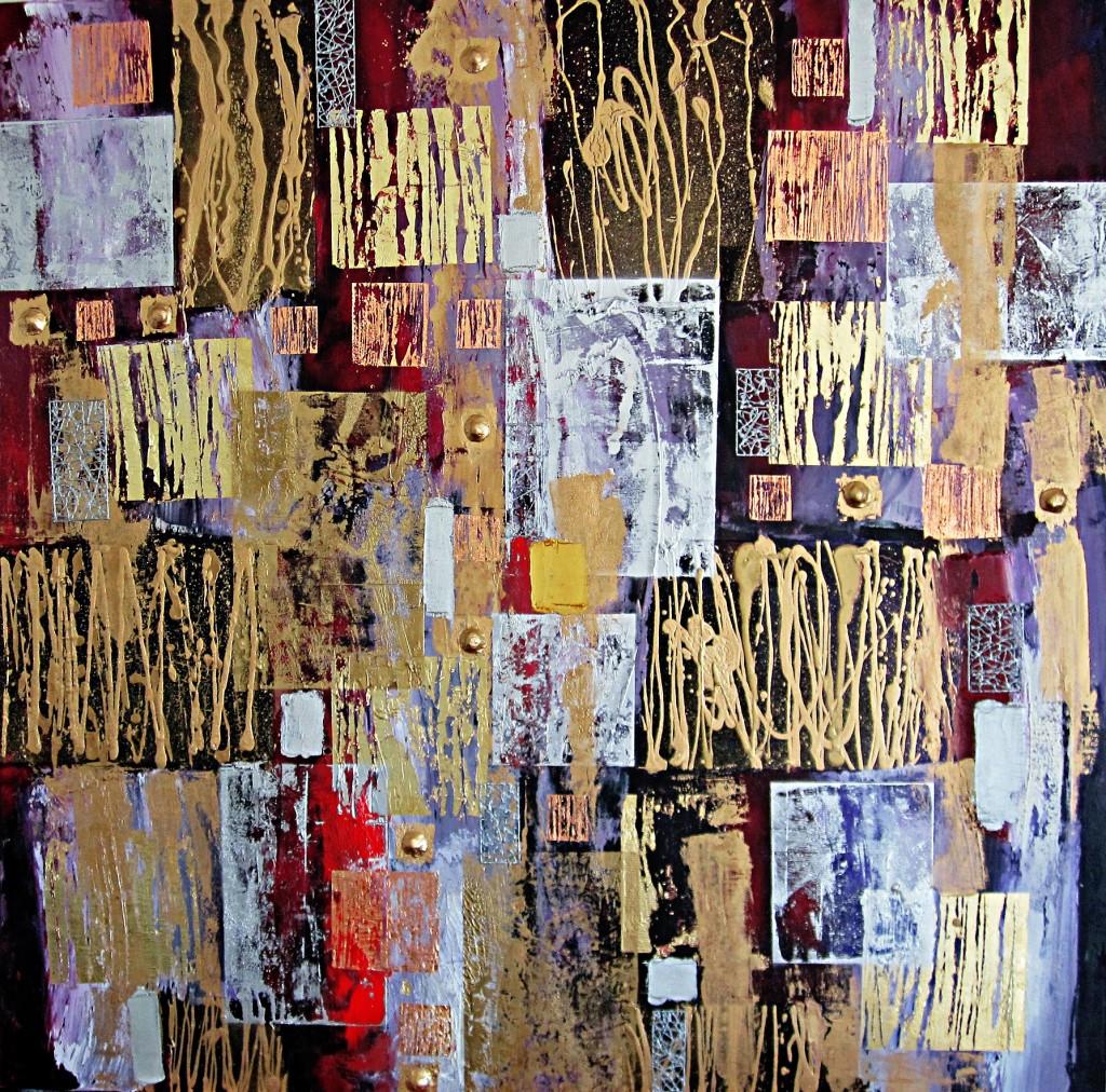 Huile sur toile et technique mixte : acrylique, peinture aérosols collage feuilles dorées et argentées, pâte à modeler durcissante, cerne relief.
