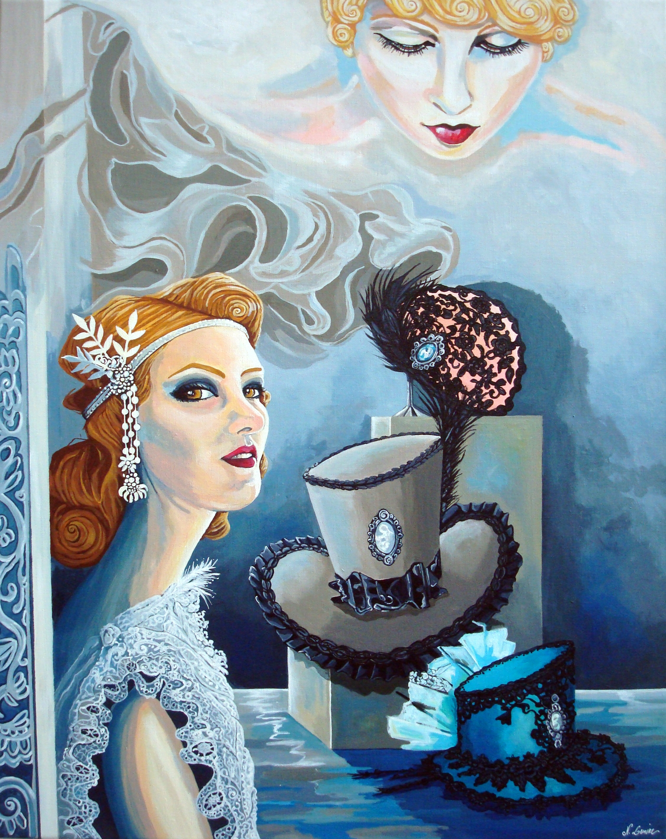 Portraits de femmes de "La belle époque" , la femme de gauche tout de dentelles blanche vêtue pourrait représenter la "mariée", grand hommage au monde du textile et surtout de la dentelle .La nature morte aux 3 chapeaux rend hommage aux métiers de modistes et de ce travail de création , le visage en arrière plan , doux et moderne représente le regard féminin sur le monde de la mode , petite inspiration de Tamara Lempicka