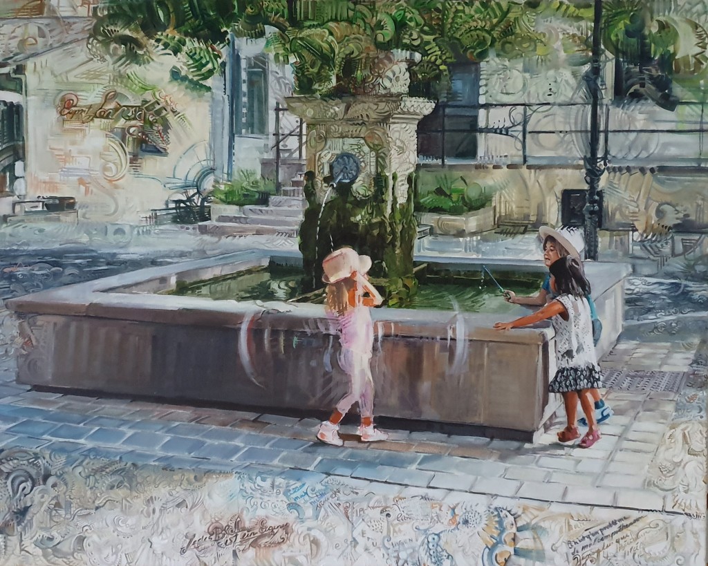 3 enfants dont un esprit jouent autour de la fontaine d'un village en Provence