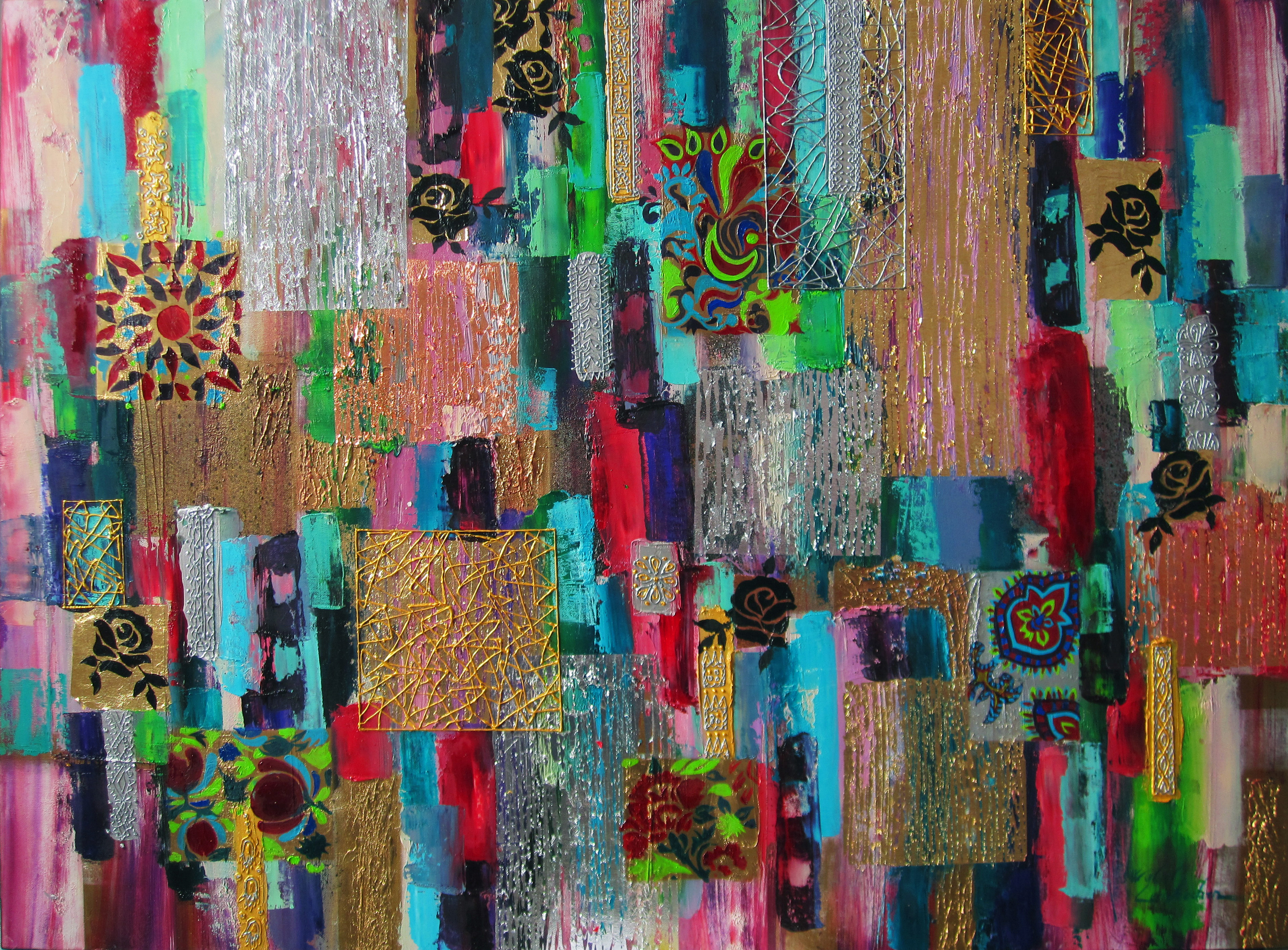 Succession des plans, jeu de matière, de texture, lumière et brillance et suspension de formes géométriques. Les Feuilles dorées et argentées griffées donnent un effet de translucidité, de légèreté et d éclat. Couleurs subtiles vives chatoyantes et puissantes qui se heurtent et se complètent à la fois créant ainsi une harmonie, une unité chromatique. La verticalité est une direction, une quête permanente d’hauteur, d’élévation, de perfection et dynamisme. Des motifs en reliefs finement exécutés d’inspiration oriental, un travail précis tell un orfèvre qui crée un bijou rare, une pièce unique prenant plaisir dans cette dans cette contrainte d’un travail minutieux tout en finess