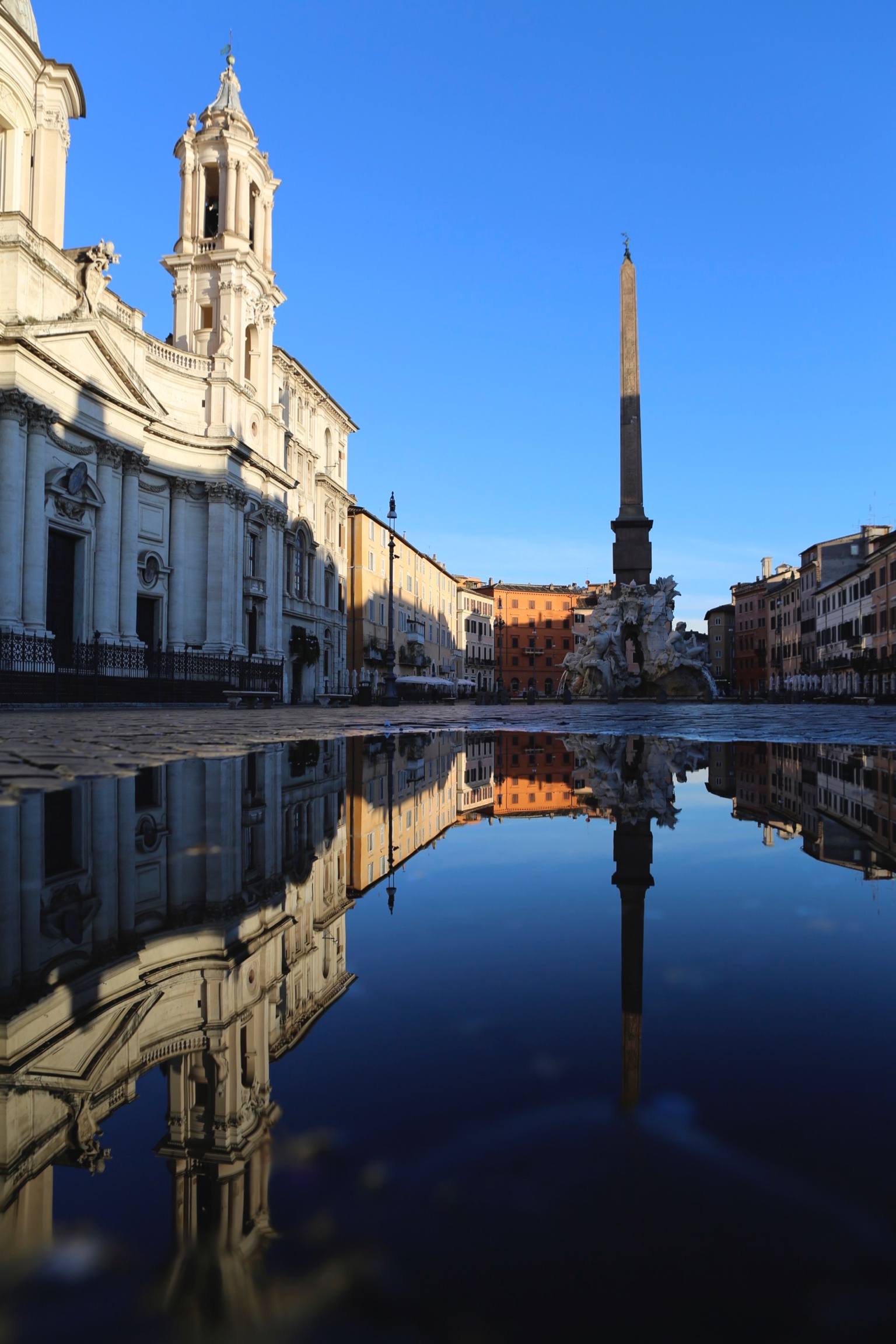 La Piazza Navona à Rome, une des plus célèbres et des plus fréquentées, au petit matin aprs l'orage de la nuit.