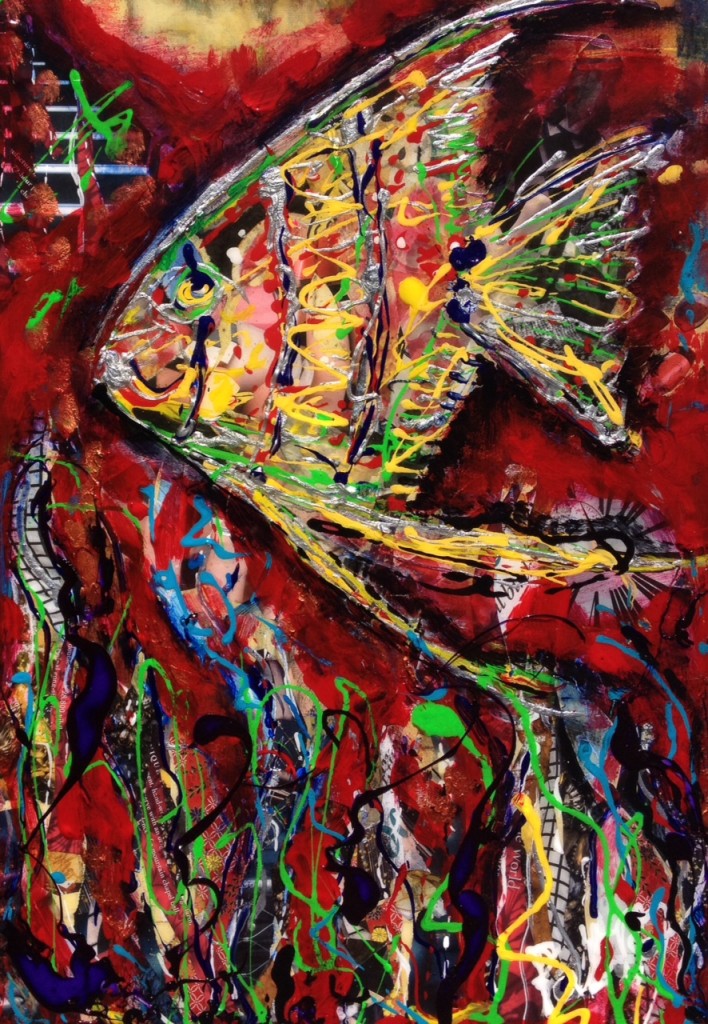 (travail de matière et de couleurs dans le fond comme dans le poisson , à l'aspect brillant )