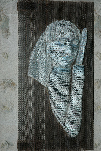 Sculpture en carton ondulé de type bas relief .La sculpture est découpée au cutter, plaque par plaque de carton, à la manière d'une imprimante 3D, pour la finesse de la découpe. Peu de retouches au cutter pour garder la transparence du carton ondulé. Mes personnages sont dits à expression variable, car leur expression se modifie en fonction de la lumière. Enduit au gesso et acrylique. Vendue