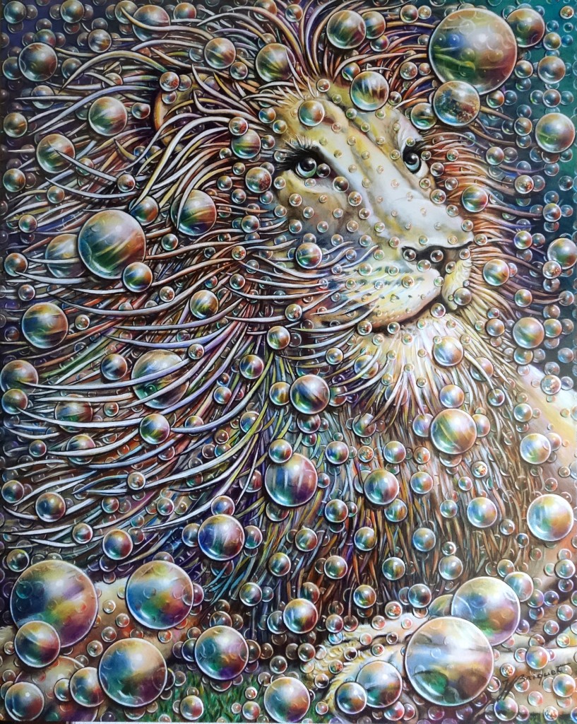 Réalisé dans les couleurs de la savane, ce lion chaleureux semble ravi par cette arrivée éphémère de bulles de savon venant comme une décoration étincelante sublimer sa beauté naturelle.