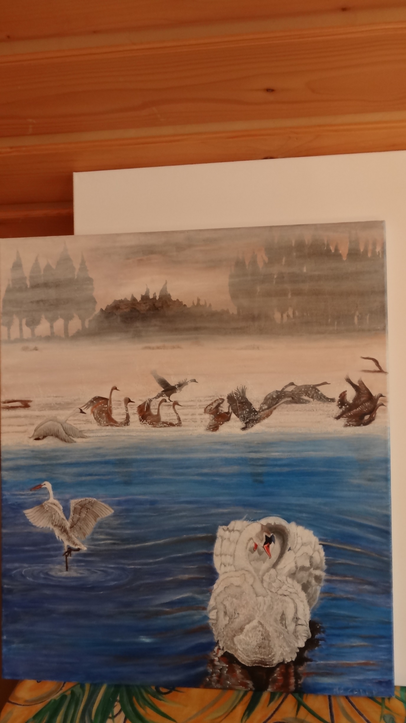 AUTRE VUE ....DE CETTE PEINTURE ........ENVOLS D OIES DANS LA BRUME DU MATIN EN PICARDIE...PLUS BAS DEUX CYGNES MONTRENT LEURS ATTACHEMENTS RECIPROQUES.....LA GRUE A LEUR GAUCHE EST FAITE DE COQUILLES D OEUFS....