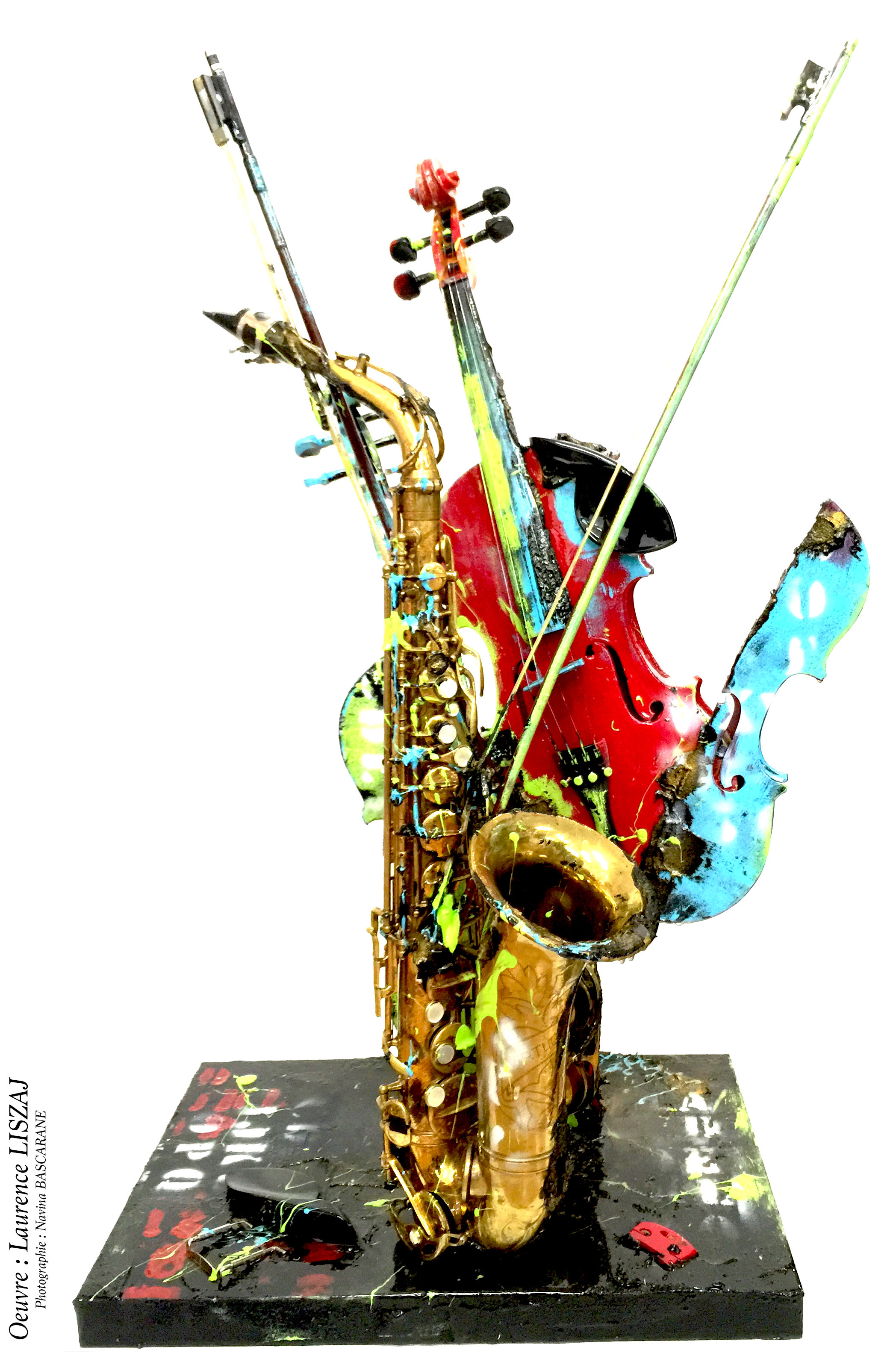 Description de l'oeuvre Sculpture de deux violons et saxophone alto
